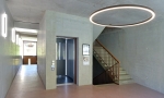 On transite ainsi de la sphère du voisinage très urbaine vers une sphère plus domestique et conviviale, impression soutenue par un changement de couleur du béton, rouge-brique dehors en référence au passé industriel et vert-familial à l’intérieur plus naturel, ainsi que par le sol pavé qui change lui aussi de teinte, devenant de plus en plus clair lorsque l’on pénètre dans l’enceinte. La façade sur rue est en béton préfabriqué panachée de teintes rougeâtres, avec des fenêtres en bois-métal et des garde-corps à barreaudage métallique.
