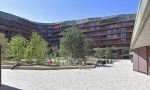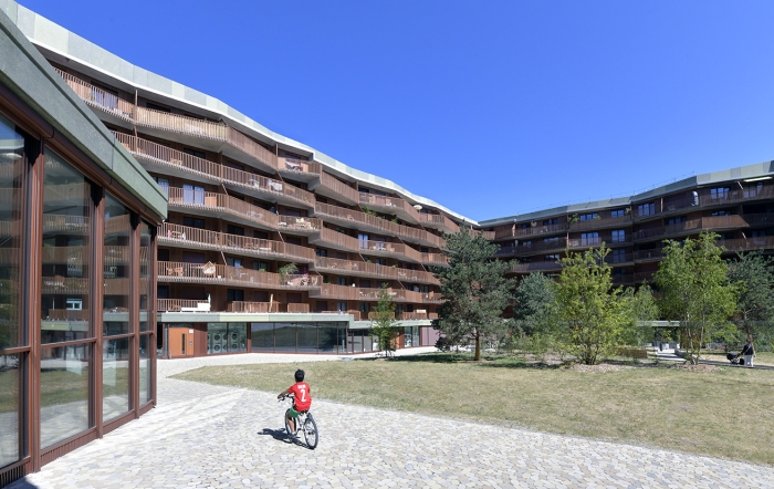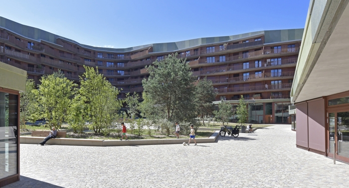 Mêlant logements et arcades commerciales, l’ensemble d’habitation est constitué de 273 logements locatifs de 2 à 6 pièces et de 11 logements PPE de 5 et 6 pièces. La forme bâtie, en îlot fermé, permet la création d’une cour arborée collective en son centre. Véritable poumon du quartier, elle est à la fois un espace de détente et de rencontre pour les habitants, et un espace public que les piétons et cyclistes traversent grâce au réseau de mobilité douce. Animé par les activités diverses qui l’entourent, le square est aussi directement accessible par les habitants par les cages d’escaliers traversantes.