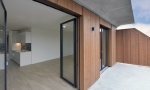 Côté cour se dresse une façade préfabriquée en bois, munie de fenêtres et de garde-corps à barreaudage également en bois. Les balcons linéaires abrités par ceux de l’étage supérieur font référence aux coursives carougeoises. Intégrés à l’ensemble, des stores à lamelles brun ocre et des bandeaux en béton vert apportent une touche de couleur.