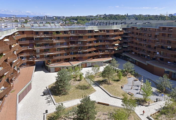 L’idée était de s’inspirer de l’îlot carougeois typique, ouvert au public, avec quatre grands passages pour que les promeneurs puissent entrer au centre de cet îlot inspiré du Vieux-Carouge et de ses placettes méditerranéennes, permettant de se rencontrer et de se rafraîchir au milieu de la végétation.