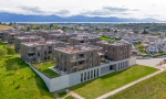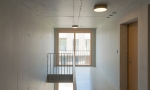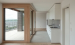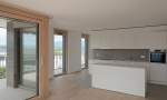 escalier/ascenseur généreuses, ouvertes sur l’extérieur et éclairées naturellement. Le visiteur trouve d’abord l’escalier afin de l’encourager à poursuivre à pied. Les cages desservent les niveaux d’habitation et le garage souterrain. Chaque palier dessert deux ou trois appartements par étage selon la typologie et taille de l’immeuble. Deux principes typologiques ont été développés afin de répondre à une diversité d’appartements répondant au marché de la propriété par étage (six immeubles) et au marché locatif (cinq immeubles dont un en logement d’utilité publique LUP), totalisant 78 appartements de 2.5 à 4.5 pièces.