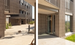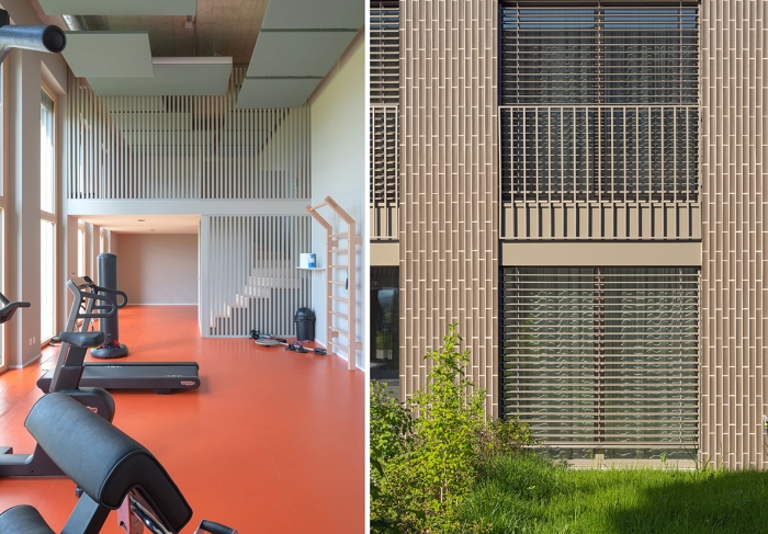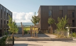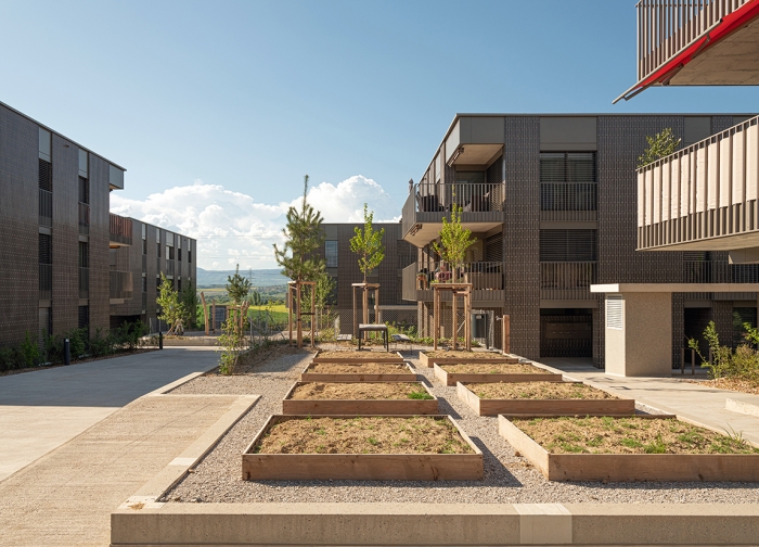 La couleur gris taupe dialogue avec les terrains agricoles environnant le quartier et avec la verdure de la végétation des aménagements paysagers en devenir. Les murs des cages d’escalier sont en béton brut. La main courante et les portes palières en chêne naturel. L’ensemble est mis en valeur par une lumière naturelle abondante. Une touche de couleur vient compléter le dispositif constructif. Les store-toiles sont déclinés en jaune, orange, ou rouge, selon les immeubles. Ce même code couleur se retrouve dans le garage pour orienter l’usager.