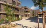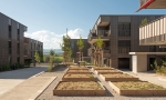 Un quartier perméable. Onze immeubles s’organisent autour de 3 placettes de référence. Ces espaces de rencontre piétons, ouverts à toutes et à tous sont accessibles en deux points depuis la route de Condémine. Ils accueillent les entrées des immeubles, les abris vélos, les jeux d’enfants et des jardins potagers partagés à une échelle urbaine domestique. Seules les parties carrossables sont en matériaux imperméables, alors que l’ensemble des aménagements extérieurs publics ou privés sont végétalisés. Une grande partie en pleine terre permet la plantation d’arbres majeurs. Depuis les placettes, un retrait du rez-de-chaussée indique l’entrée de chaque immeuble.