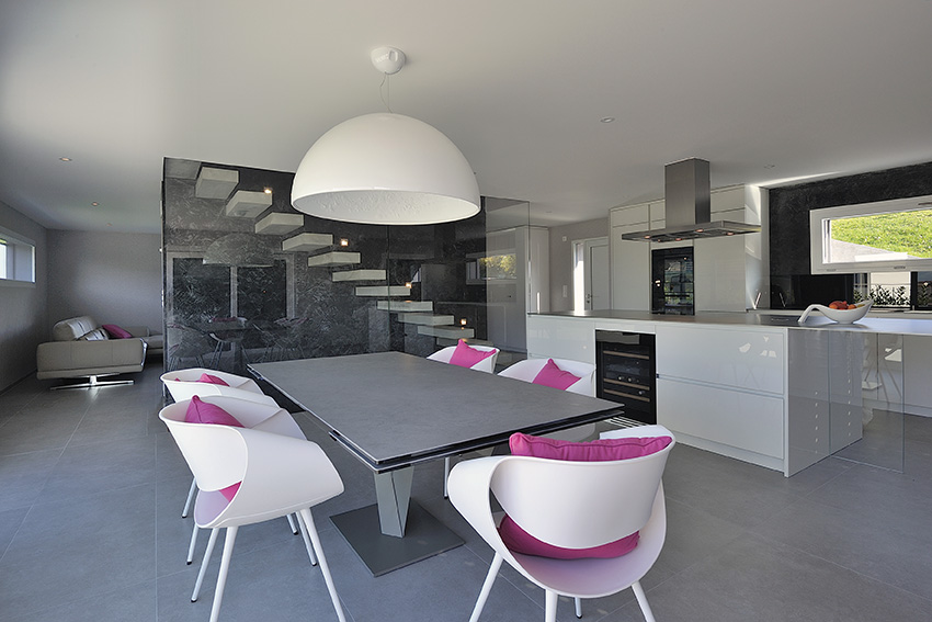 double. Le rez-de-chaussée comprends une cuisine dotée d’un grand îlot central, ouverte sur la salle à manger. La grande baie vitrée à l’angle sud-ouest de la villa prolonge l’espace