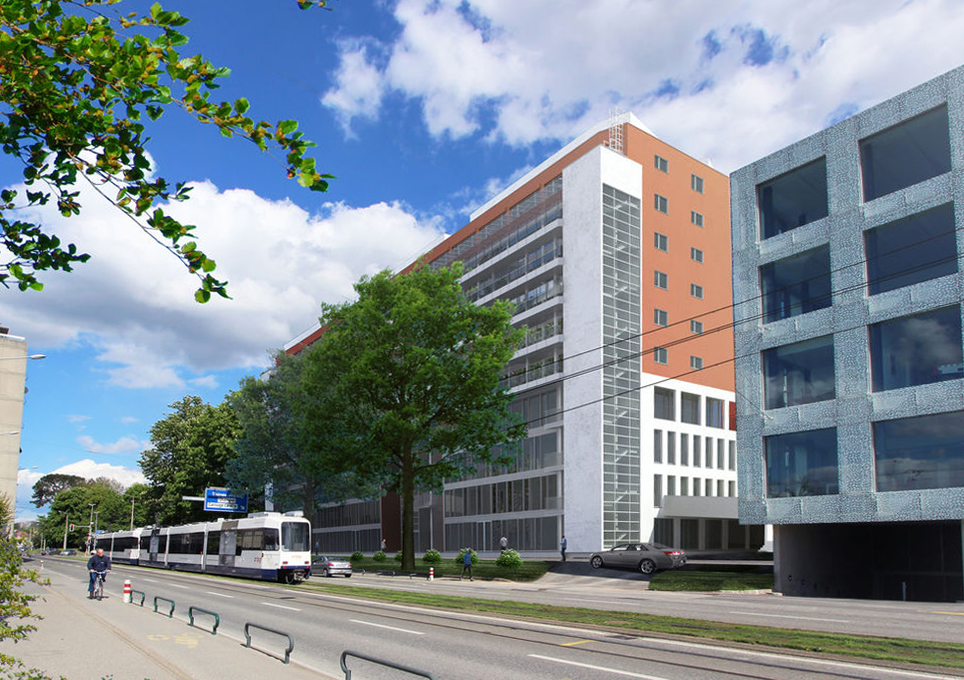 L’immeuble mixte labellisé HPE offre à la vente des surfaces commerciales et administratives aux étages inférieurs, 16 appartements de standing au 5ème étage et en attique, ainsi que des places de parking en sous-sol.