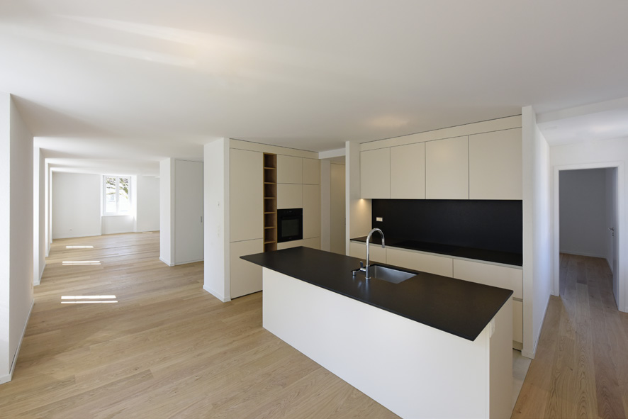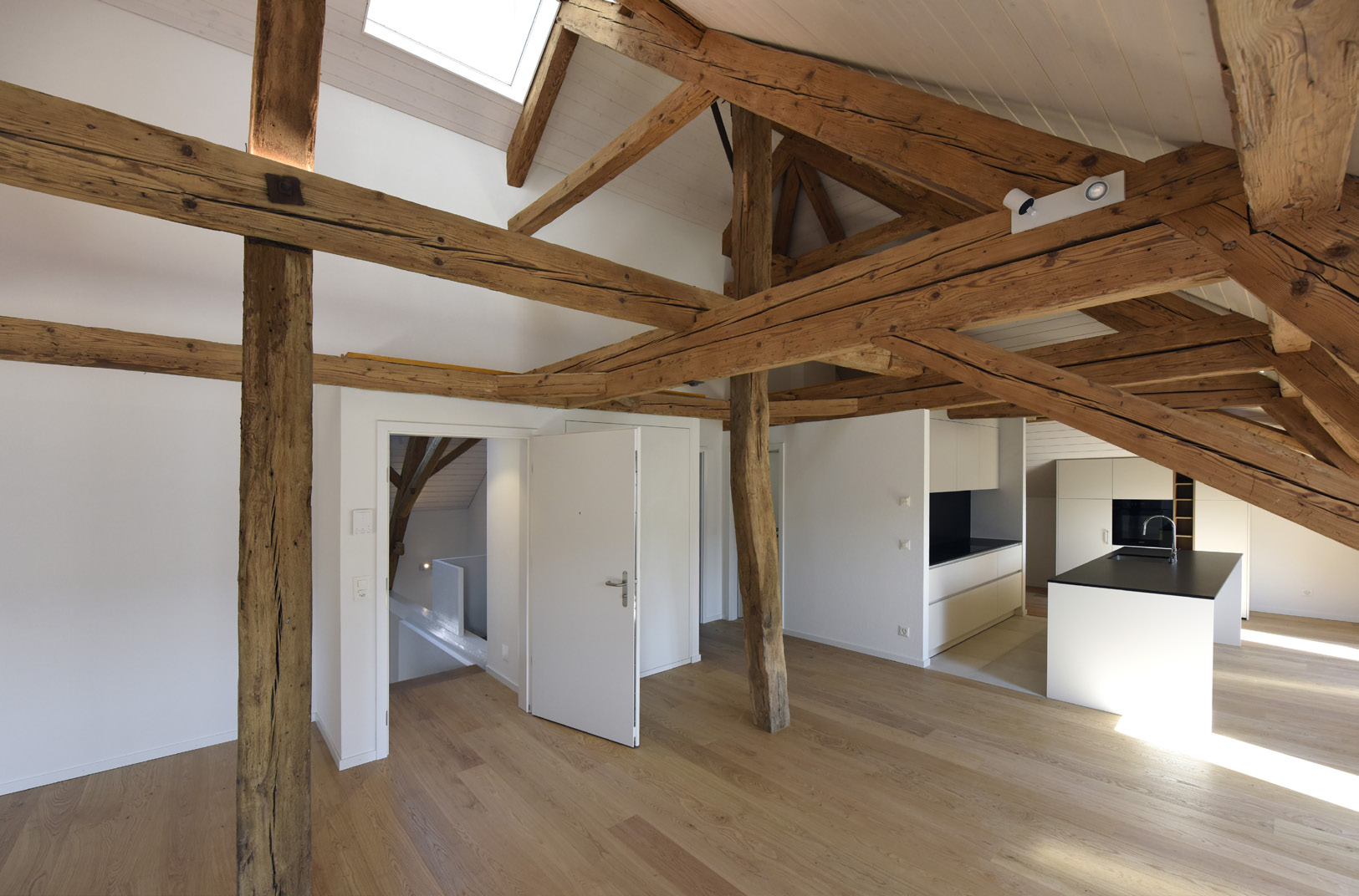 Deux fenêtres initialement peintes en trompe l’œil marquant l’ancien emplacement du tableau noir ont été ouvertes en suivant les moulures extérieures afin d’amener la lumière dans les chambres à l’étage. Dans l’appartement des combles, l’apport de lumière provient principalement de nouvelles ouvertures de toit, ainsi que de la rénovation d’une lucarne. L’ajout de vitrages sous le clocher complété par le remplacement des cadrans de l’horloge avec des verres translucides imprimés du motif de l’ancienne horloge offrent en plus de la lumière indirecte, un point de vue unique et atypique sur le clocher.