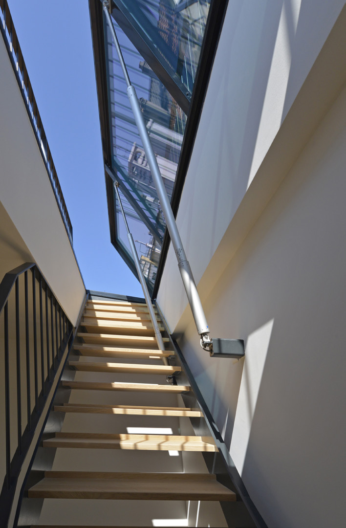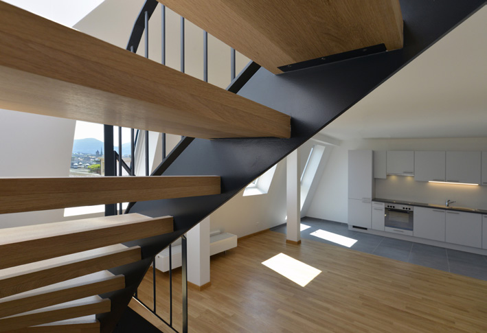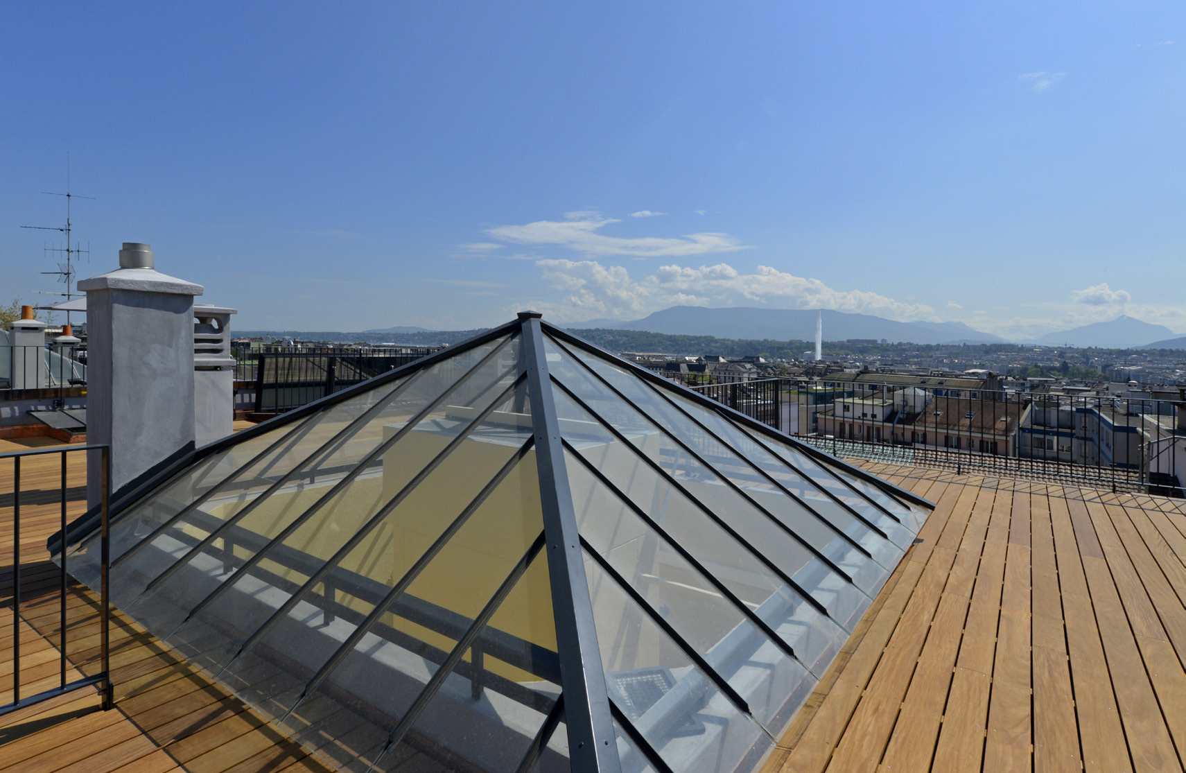 AMÉNAGEMENT DES COMBLES ET CRÉATION DE TERRASSES Réalisé par Jean Camoletti en 1927, l’immeuble concerné s’inscrit pleinement dans cette dynamique, avec une axialité marquée et une composition stricte dissimulée sous une mise en oeuvre faussement rugueuse. Géré par Cogerim Société Coopérative de Gérance Immobilière pour le compte de la Société coopérative d’habitation Fomhab (l’une des plus anciennes du canton), il se voit désormais revalorisé grâce à un projet aux ambitions simples et claires, dans le respect de la vision de la Coopérative: construire des logements de qualité afin de les mettre à disposition de ses sociétaires, à des conditions avantageuses. L’aménagement des combles, la création d’une terrasse en toiture et les mises aux normes diverses induisent des interventions mesurées, propres à maintenir les singularités de ce bâtiment historique. Le relevé détaillé a permis de cerner l’ADN du lieu et de distinguer la substance ancienne des modifications effectuées au fil du temps. Dans le maintien exact du volume existant, à la place d’anciens galetas, d’une buanderie et d’un logement de deux pièces, les nouveaux appartements proposent trois chambres habitables et un grand espace commun pour le séjour et la cuisine. Accessibles par un ascenseur prolongé jusqu’au dernier palier, ces deux unités de logement de cinq pièces sont traversantes, avec des zones jour et nuit distribuées de part et d’autre d’un hall central et d’un bloc sanitaire (WC séparé et salle de bain). Les nouvelles prises de jour s’inscrivent dans la toiture à la Mansart, dans l’alignement des fenêtres situées aux étages courants. Cerise sur le gâteau, la terrasse occupe toute la toiture de l’immeuble. Elle se divise en deux, au bénéfice exclusif des nouveaux appartements et accessible depuis chacun des séjours par une grande verrière automatisée. Le dispositif est soigné, sans élément émergeant, avec des garde-corps posés en retrait du nu de façade, volontairement imperceptibles depuis la rue. La vue qui s’y dégage est impressionnante, ouverte sur la Vieille-Ville, le jet d’eau et les montagnes. La modernisation de l’ascenseur existant, surélevé d’un niveau, dessert les nouveaux logements et l’aménagement de la buanderie au sous-sol complète ces travaux qui améliorent l’usage courant et rendent l’exécution générale conforme aux normes SIA ou aux directives cantonales et communales. Un assainissement discret qui participe de l’indéniable hausse qualitative apportée par ce projet audacieux et parfaitement maîtrisé.