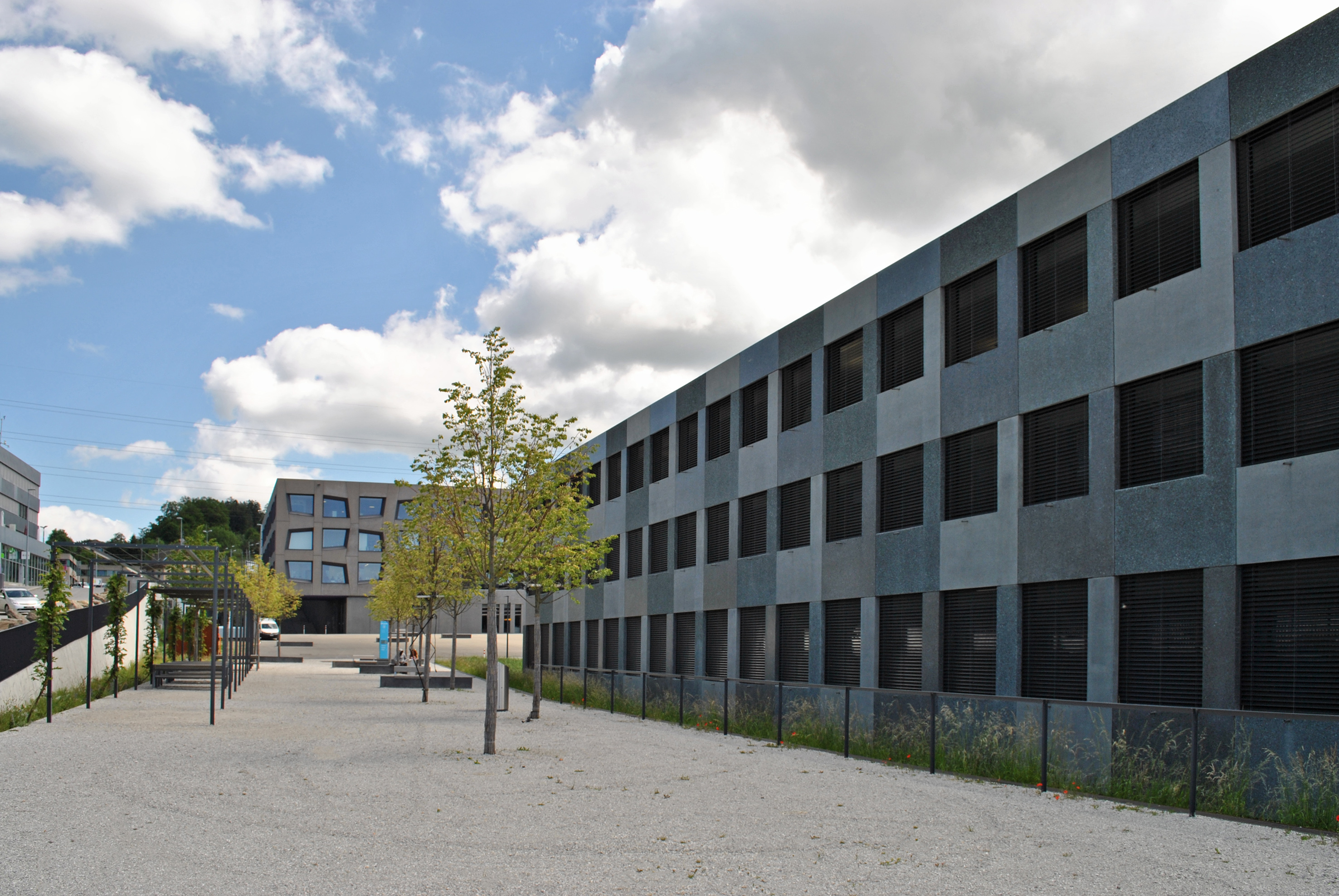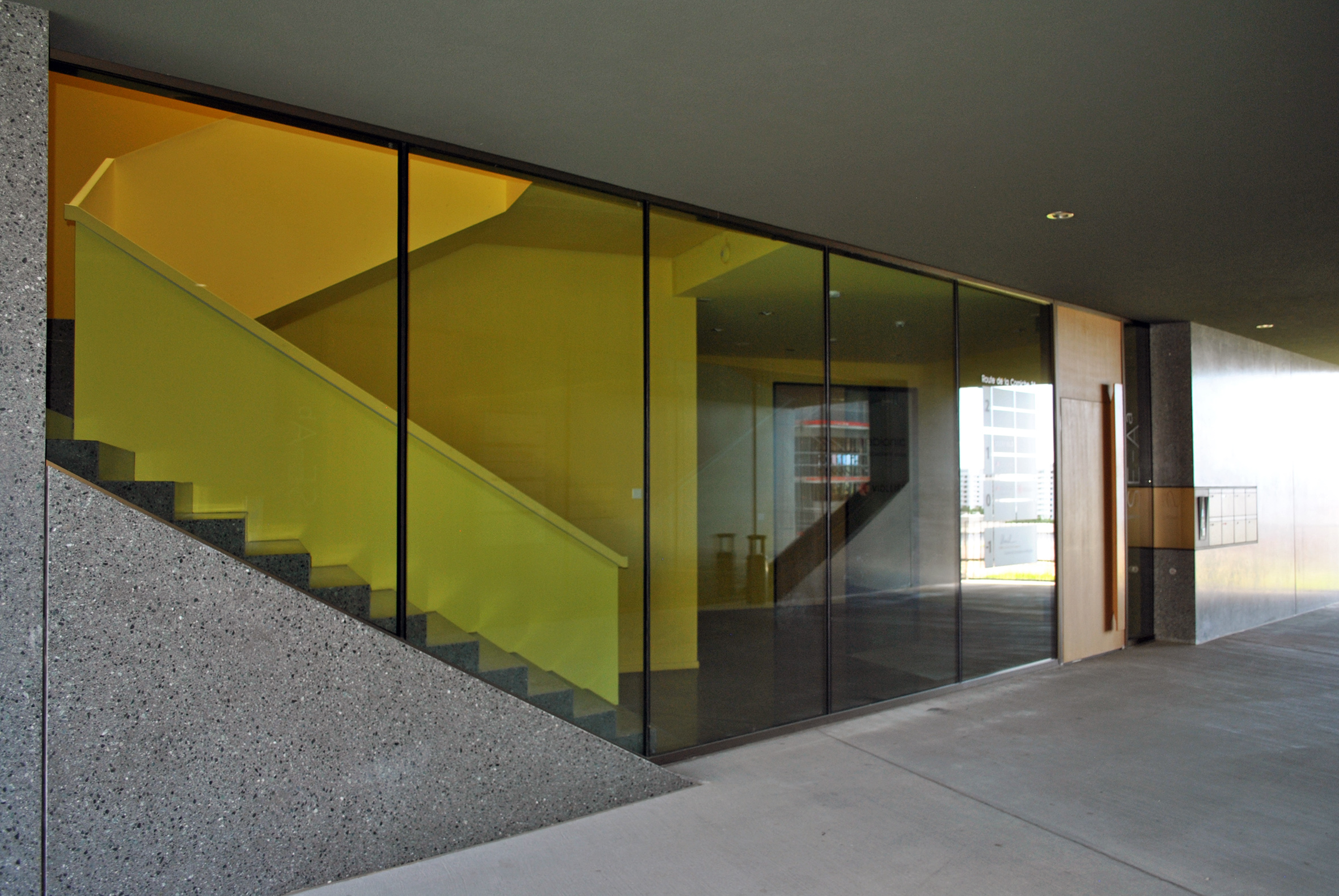 la façade en éléments préfabriqués béton s’inspire d’une toile de Paul Klee de 1930, intitulée «Rythmique». L’effet de couleurs est obtenu à partir des mêmes agrégats du béton, dont la surface est traitée différemment,