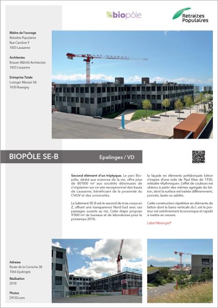 Le bâtiment SE-B est le second de trois corps en Z, offrant une transparence Nord-Sud avec ces passages ouverts au rez. Cette étape propose 9’000 m2 de bureaux et de laboratoires pour le printemps 2018.