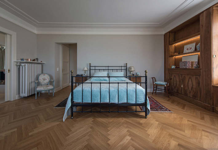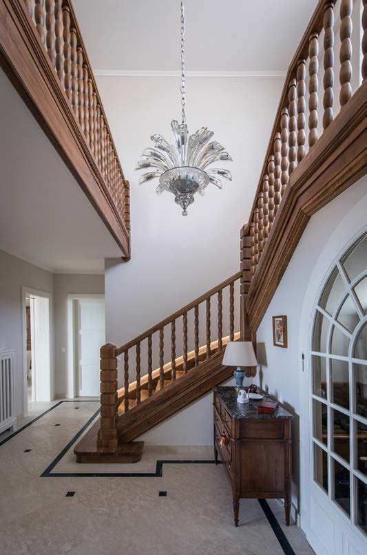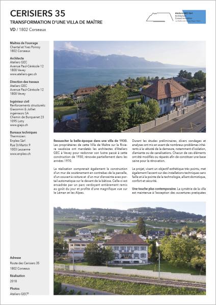 Ressusciter la belle-époque dans une villa de 1930. Les propriétaires de cette Villa de Maître sur la Riviera vaudoise ont mandatés les architectes d’Ateliers GEC à Vevey pour redonner son lustre passé à cette construction de 1930, rénovée partiellement dans les années 1970. La réalisation comprenait également la construction d’un mur de soutènement en contrebas de la parcelle, d’un couvert à voiture et d’un mur d’enceinte avec portail automatique sur le devant de la bâtisse. Celle-ci est encadrée par un parc verdoyant entièrement remis au goût du jour et profite d’une magnifique vue sur le Léman et les Alpes. Durant les études préliminaires, divers sondages et analyses ont mis en avant de nombreux problèmes inhérents à la vétusté de la demeure, notamment d’isolation, d’amiante ou de canalisations. Chacun de ces éléments ont été modifiés ou réparés afin de constituer une base saine pour la rénovation. Le projet, visant un objectif esthétique pointu, met également l’accent sur des installations techniques sans faille et à la pointe de la technologie, alliant domotique, confort et sécurité. Une touche plus contemporaine. La symétrie de la villa est maintenue à l’exception des ouvertures pratiquées préalablement entre la cuisine, le séjour et la salle à manger et qui donnent aussi un caractère contemporain à ces pièces de vie. En plus des deux chambres indépendantes destinées à être utilisées comme bureaux, trois suites sont aménagées avec une chambre, un dressing ainsi qu’une salle de bain privative. Les murs et les plafonds sont unis et lissés au plâtre tout en mettant en évidence les moulures caractéristiques de l’époque par la mise en place de bandes lumineuses intégrées. De la même manière, les menuiseries sont restaurées et peintes en blanc. Les fenêtres ont été remplacées tout en conservant l’aspect d’époque. Les techniques, électricité, chauffage et sanitaires sont entièrement nouvelles. Les sols sont quant à eux revêtus de parquet dans les chambres et de magnifiques carreaux de pierre calcaire, ponctués de cabochons en marbre noir, importés directement d’Italie.
