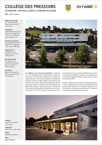 Confrontée à un fort développement depuis plusieurs années, la Commune de Lonay était cruellement en manque de places d’accueil de jour pour les élèves du Collège des Pressoirs construit en 2004. L’UAPE La Fourmilière, active depuis la construction, débordait depuis des années sur une petite annexe "provisoirement" aménagée dans la Maison des Pressoirs, voisine de l’école. Le Canton ne renouvelant plus l’autorisation d’exploiter cette salle, la Municipalité a cherché la meilleure solution pour créer une Unité d’accueil pour écoliers (UAPE) et une cantine à proximité du collège et satisfaisant aux exigences accrues de l’Etat depuis l’entrée en vigueur de la nouvelle loi scolaire de 2013. D’idées émises en projets avortés, le temps passe et le Canton s’impatiente. Le bureau Sennwald Architectes propose alors, fin 2016, une extension intégrée au bâtiment existant côté préau sud, exploitant au maximum le coefficient constructible de la parcelle. Séduite par la faisabilité du projet, la Commune dépose un préavis de réalisation, accepté par le Conseil Communal en mars 2017, et lance une procédure ouverte en appel d’offres public. Composer avec l’architecture existante. Les travaux d’agrandissement commencent dès les vacances scolaires de juillet 2017. La nouvelle construction vient s’inscrire dans les lignes du collège existant conçu comme un volume pur en pierre abritant 12 salles de classes et quelques salles spéciales. Les travaux de reprise en sous-œuvre de la façade sud et les ancrages dans le terrain, à l’aide de quatorze "clous" de 9 mètres de long, générant bruit et vibrations ont été réalisés alors que les élèves étaient en congé estival. La fin du gros œuvre s’est prolongée sur l’automne, tout en ayant soin de trouver les solutions les plus appropriées pour perturber a minima la poursuite de l’enseignement dans le collège maintenu en fonction. Les travaux bruyants, bétonnages ou sciages, sont calés le mercredi après-midi ou dès la fin des cours. Le projet d’agrandissement abrite une Unité d’accueil pour écoliers (UAPE) de 60 places et une cantine scolaire de 150 places, séparées par une cuisine. L’adjonction joue avec les différences de niveau des préaux supérieur et inférieur et permet de combler le manque d’espaces extérieurs couverts et d’espaces verts par l’aménagement en toiture d’un jardin-préau. Ces touches végétales, comme l’aménagement d’assises, de zones d’ombre et d’une fontaine à eau sont le fruit d’une consultation des élèves de l’établissement, qui souffraient de la trop forte "minéralité" des préaux. Des mûriers maitrisés, des glycines en bacs devant les baies vitrées atténuent les rayons du soleil et optimisent la température intérieure. Une vigne vierge sur le mur de soutènement ouest permet aux élèves de vivre avec la nature et de suivre son évolution, ses couleurs, au fil des saisons. Les enfants de 4 à 9 ans accueillis à l’UAPE passent beaucoup de temps dans ces murs, parfois depuis 7h le matin, puis le repas à midi et l’accueil après les cours jusqu’à 18h30. C’est pourquoi un jardin des sens a été créé pour les plus petits, les éduquant au jardinage, à la découverte et à la cueillette de framboises, kakis ou figues en saison. Espaces distincts séparés par la cuisine centrale. A l’ouest, un espace repas et goûters et un espace activités et jeux avec accès au jardin des sens extérieur constituent l’UAPE, avec un bureau pour la directrice et le personnel, ainsi qu’un vestiaire. A l’est, un grand espace libre de porteurs est aménagé en cantine. Les repas sont livrés par un traiteur extérieur et régénérés dans la cuisine professionnelle sur place. 150 repas peuvent être servis à midi, ce qui constitue un beau challenge. L’architecture d’intérieur a été dessinée et choisie par les architectes du projet, des meubles de sensibilisation au tri sélectif, aux vestiaires et à la signalétique. Le résultat est à la hauteur des attentes avec un espace aux murs et plafonds bruts et sobres, contrastant avec les teintes vives et plus enfantines des chaises et des menuiseries. Le mobilier multicolore, en deux tailles s’adaptant à l’âge des enfants, est aussi pratique avec des chaises qui se crochent sous les tables pour faciliter le nettoyage. L’acoustique a été particulièrement soignée, dans cet environnement que l’on imagine volontiers bruyant, avec ces panneaux acoustiques blancs au plafond (dont le dessin est identique à celui des plafonniers) et aux parois absorbantes. L’espace faisant 15 mètres de profondeur, des puits de lumière permettent d’éclairer naturellement les vestiaires et les bureaux situés au fond. Les techniques, eau, chauffage et ventilation sont reprises depuis le collège existant au travers d’une gaine technique sur l’arrière de la nouvelle construction. Un faux-plafond technique assure la protection incendie et dispense l’éclairage, le chauffage et la ventilation pour un confort optimal.