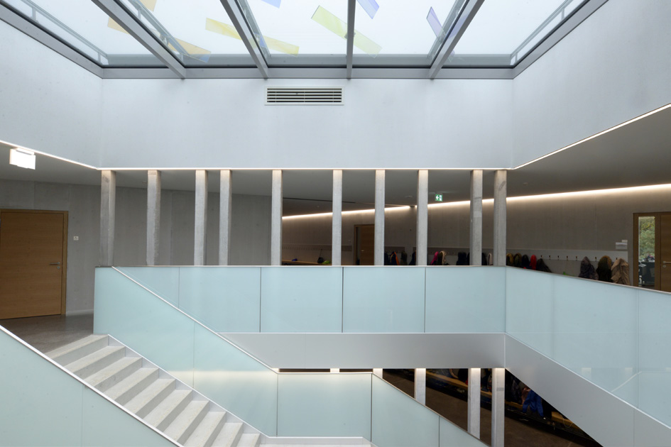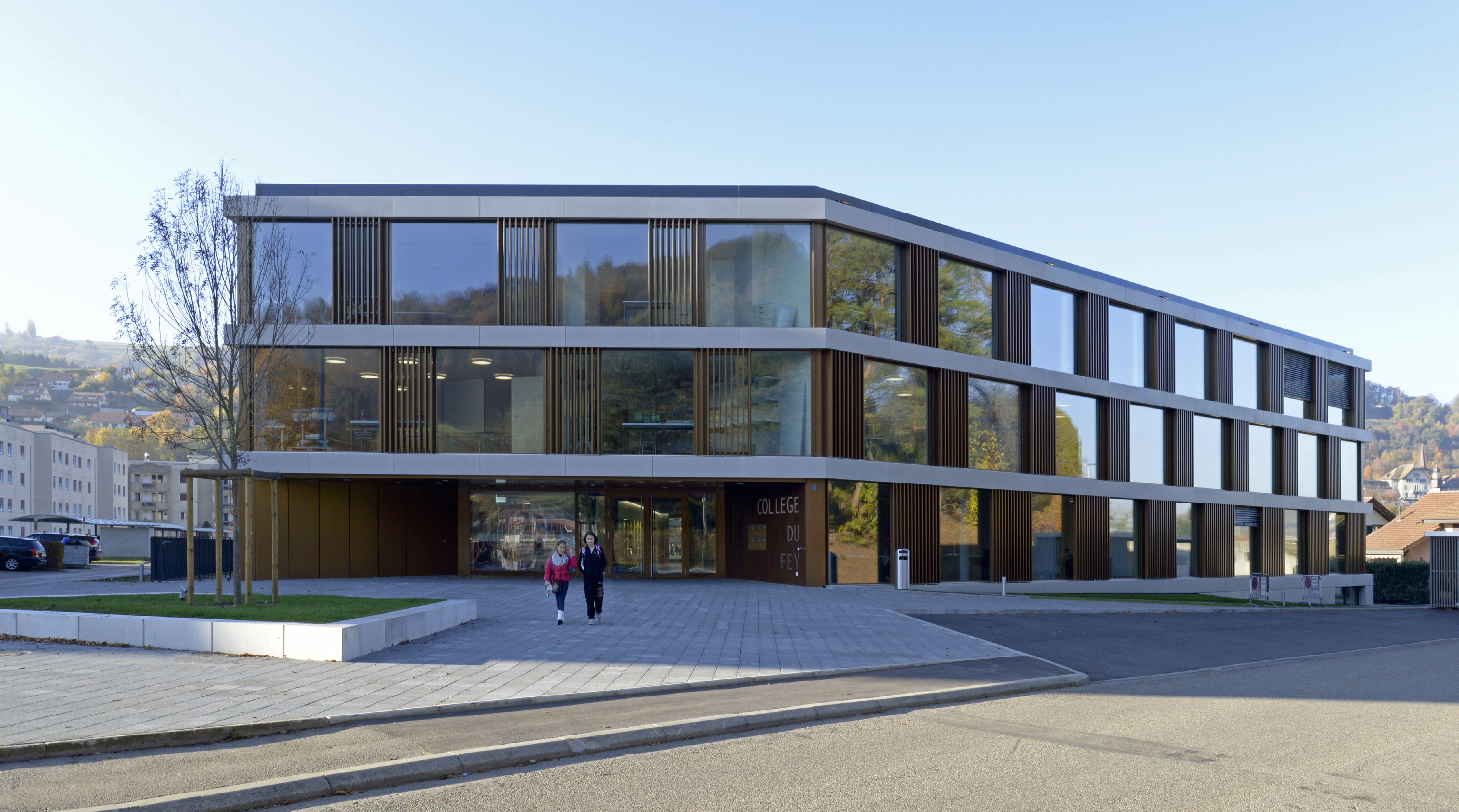Répondre aux besoins démographiques. La région connaît un développement important ces dernières années, conduisant l’Association Intercommunale Scolaire de Moudon-Lucens et environ (AISMLE) à construire un nouveau Collège primaire. Le site du Fey à Moudon, légèrement décentré au sud de la Ville, a été choisi pour ses qualités, cadre environnemental et paysager de grande qualité, intégration au futur pôle d’enseignement comprenant une salle de gymnastique omnisport et ses prédispositions à l’utilisation des mobilités douces. Le nouveau bâtiment s’intègre entre une zone d’immeubles d’habitation de 4 à 6 étages au sud et une zone villas côté Ville. Implanté au coin sud-est de la parcelle, il dégage un maximum d’espace pour le préau ouest, sécurisé et protégé des nuisances sonores. Côté entrée principale, un ilot de verdure surélevé permet aux élèves de s’asseoir en attendant la sonnerie. Une zone de dépose rapide le long du bâtiment et un parking pour les enseignants à l’arrière canalisent les véhicules en périphérie du site. De nombreuses places de parc pour vélos incitent à ce mode de transport. Programme développé sur quatre niveaux. Le projet est proche d’un carré dont on a volontairement infléchi les faces, pour réduire l’aspect massif du cube. Ce choix permet de créer un couvert sur l’entrée principale et un préau couvert à l’opposé en accentuant le renfoncement au rez-supérieur. Les deux étages supérieurs accueillent les 19 classes et les salles spéciales de travaux manuels et dessin, alors que le rez-de chaussée supérieur, s’ouvrant sur le préau, comprend le secrétariat de l’école, la salle des maîtres et l’UAPE "Le Château", avec son entrée indépendante et son préau sécurisé, qui accueille 48 enfants le matin avant l’école, à midi et l’après-midi après l’école. Un petit réfectoire permet de servir les repas à midi. Au rez-inférieur, semi-enterré, on trouve une salle polyvalente, salle de rythmique, la bibliothèque, les locaux techniques et un abri de protection civile de 770 m2. Construction durable intégrée à son environnement. La structure de l’école est composée de dalles en béton, portées par des murs voiles et des piliers préfabriqués. Le choix des matériaux intérieurs est sobre et fonctionnel, laissés semi-bruts. Les chapes poncées sont revêtues d’une résine coulée et les murs en béton recouverts d’une légère lasure blanche. Les portes en bois apportent une touche chaleureuse à l’harmonie de l’ensemble. La cage d’escalier centrale est éclairée zénithalement par une grande verrière. Les plafonds acoustiques sont dotés de bandeaux lumineux LED éclairant en lumière rasante les vastes couloirs. Afin d’offrir une luminosité naturelle maximale aux salles d’enseignement disposées en périphérie du bâtiment, les vitrages triples aluminium-bois sont disposés sur toute la hauteur d’étage, dégageant une vue saisissante sur l’extérieur. Un climat intérieur agréable est assuré par un chauffage à distance, des panneaux photovoltaïques en toiture et distribué par une ventilation douce dispensée au travers des faux-plafonds. Dispositif que l’on peut compléter en ventilation naturelle par l’ouverture des fenêtres dissimulées derrière les claires-voies métalliques qui rythment les façades. La régulation MCR, gérant la ventilation, le chauffage et les stores à lamelles permet d’optimaliser la température et la luminosité pour le confort des occupants.