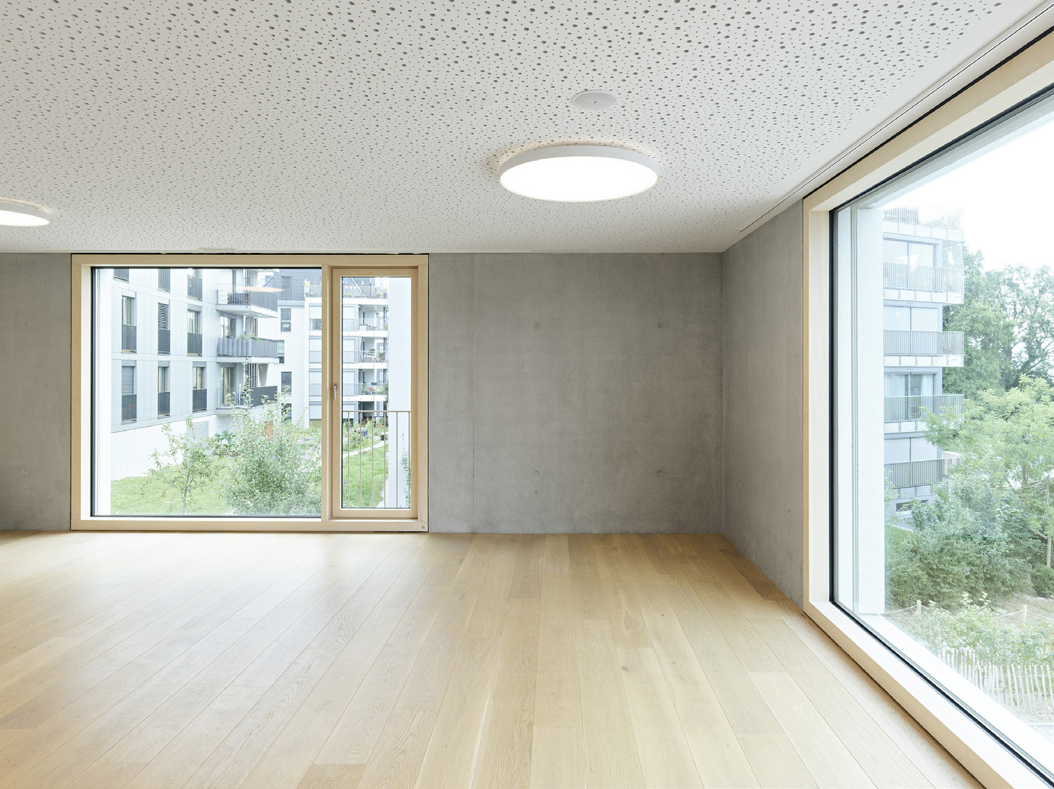 Par sa position pivot au sein de ce site, sa morphologie en plot, sa planimétrie et le jeu des ouvertures de ses façades, l’école offre des salles de classe aux qualités identitaires bien marquées les unes par rapport aux autres, en termes d’orientations, de vues, et de rapports dimensionnels tout en préservant un confort similaire entre chacune d’elles. La structure des étages inférieurs est en béton, alors que celle des deux derniers étages est en bois. Les planchers des 2ème et le 3ème étages sont composés d’une structure mixte bois-béton. Le rez-de-chaussée est traité comme un socle en béton préfabriqué. Les façades ventilées des étages sont caractérisées par un revêtement en bois composé d’un traitement d’usine qui offre une pérennisation des surfaces (lasure grise). Le préau de 1’500 m², plutôt introverti, offre une zone récréative plantée d’arbres majeurs qui définissent autant de sous-espaces: les cours Nord, Est et Ouest.