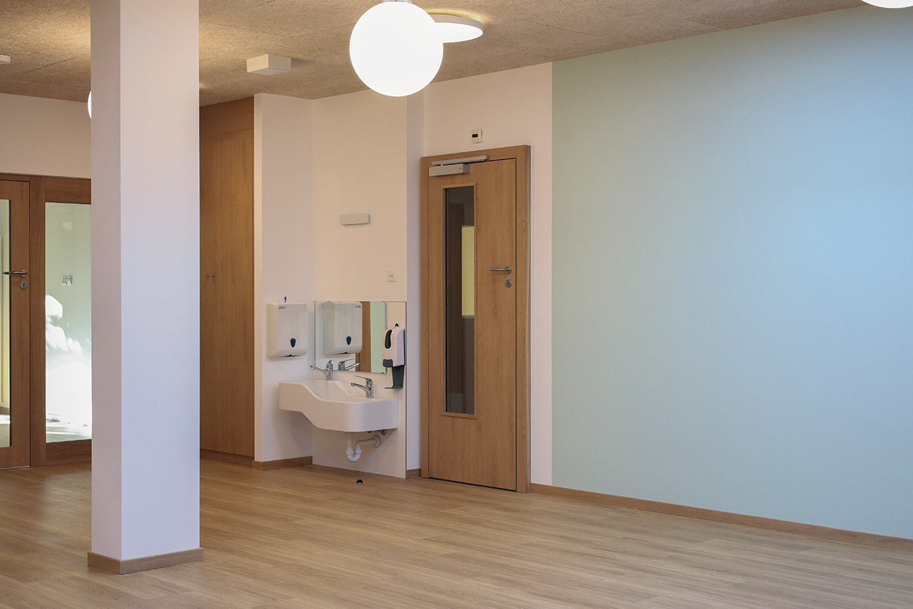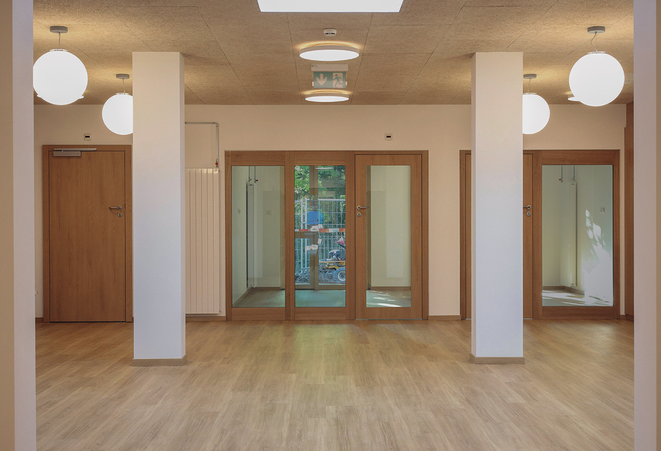 Cette implantation a permis de préserver les arbres et de maintenir l’intégralité du terrain naturel, offrant ainsi un cadre de vie agréable aux enfants. Dans une approche écologique et axée sur le développement durable, le projet vise à protéger l’environnement en minimisant l’impact sur les sols et sous-sol. Pour ce faire, le bâtiment a été raccordé aux infrastructures existantes (canalisations, électricité, eau, chauffage à distance), évitant ainsi des travaux de fouilles inutiles.