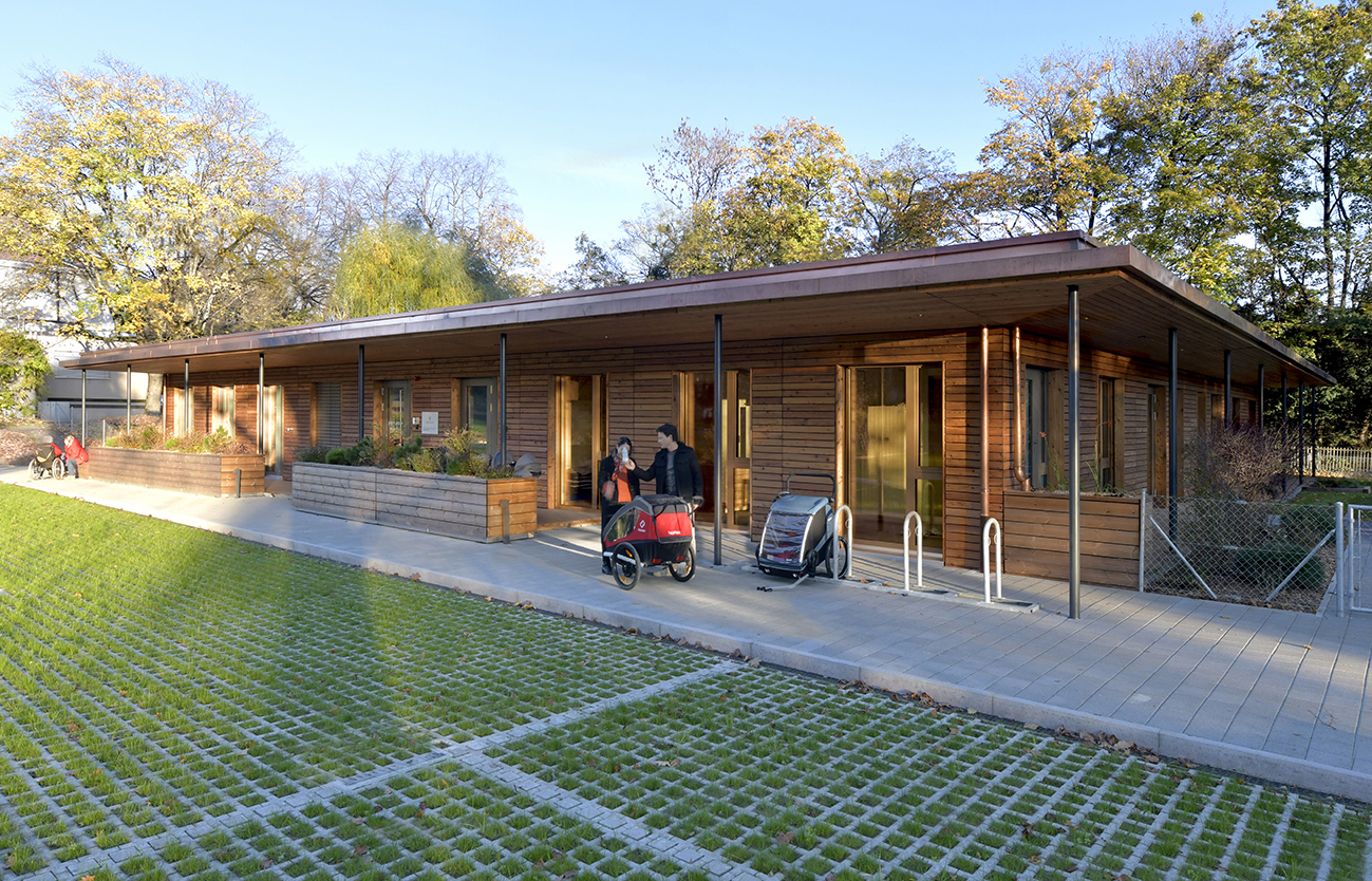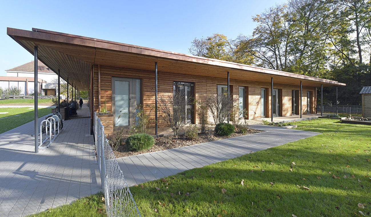 Une crèche modulaire en bois, démontable et adaptable. Située à la Route du Vallon à Chêne-Bougeries, cette crèche provisoire en bois s’intègre harmonieusement à son environnement naturel.