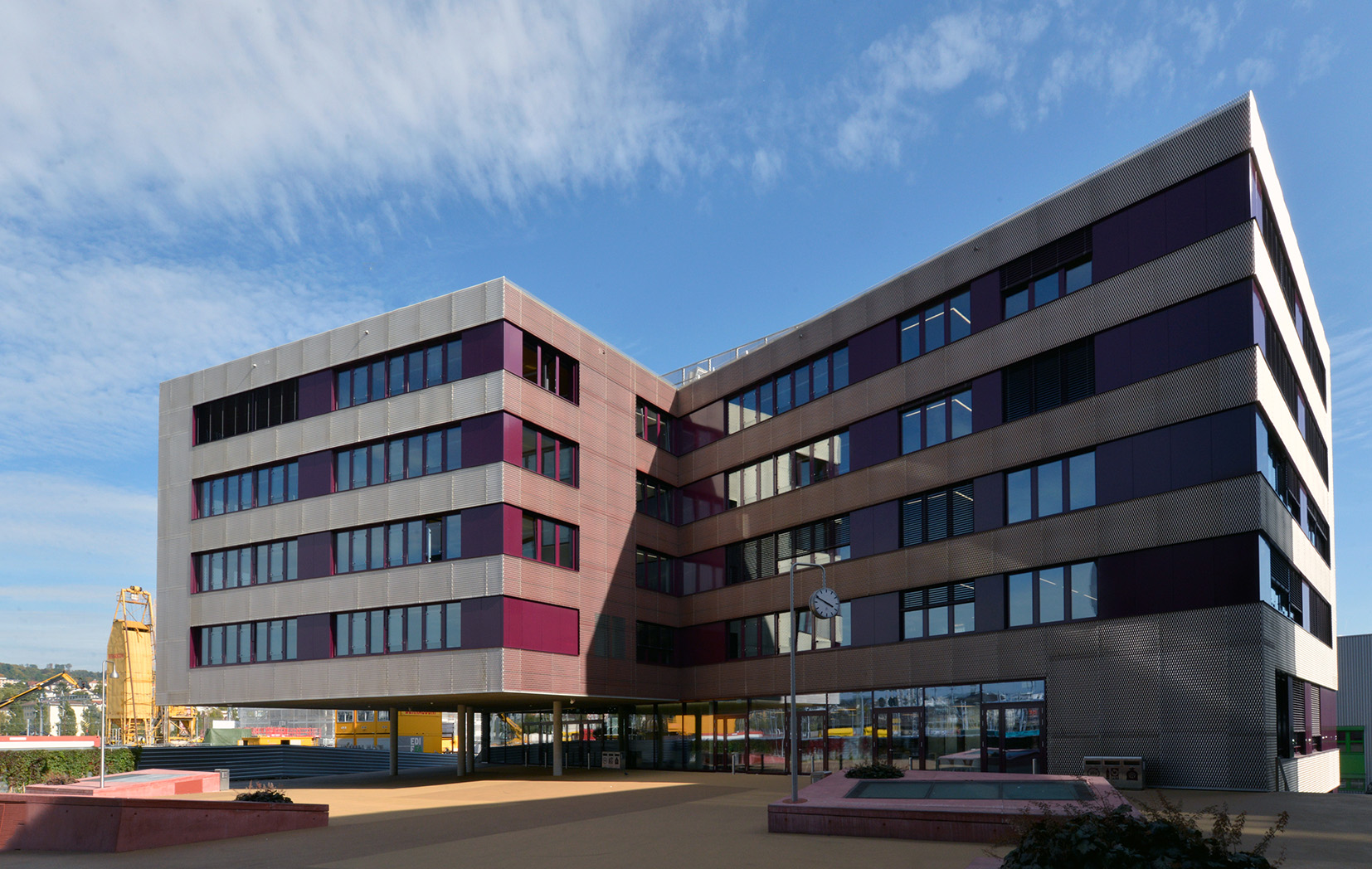 Les façades ventilées sont revêtues d’une grille d’aluminium déployé, léger et transparent sur l’isolation périphérique et une toile d’isolation couleur aubergine. Selon l’angle de vue et la lumière, les bâtiments sont de teintes changeantes du rouge vif au violet aubergine.