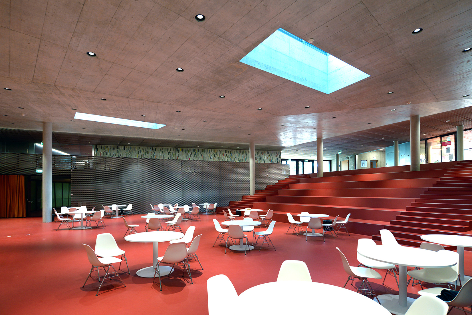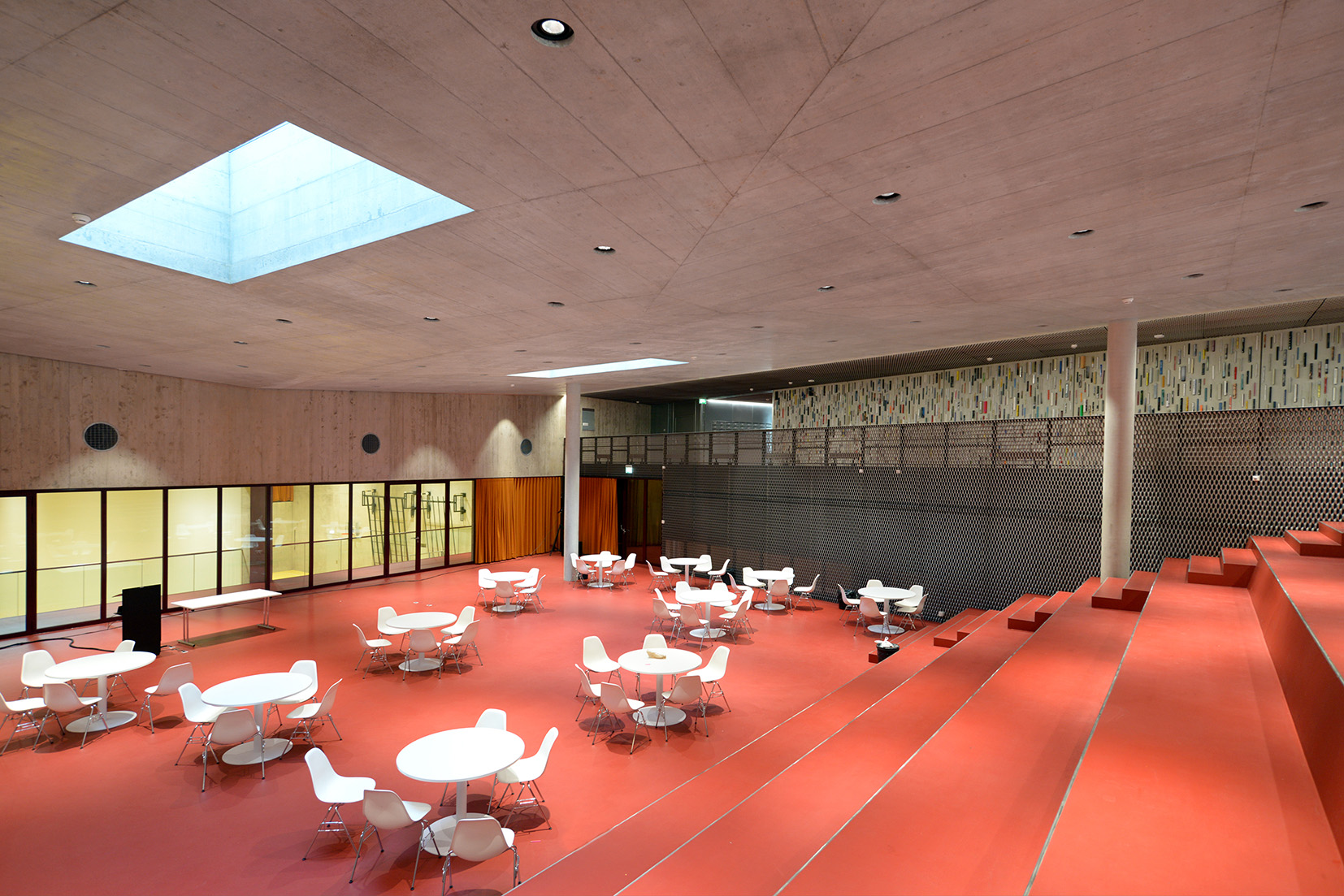 A l’intérieur, on arrive directement sur cet aula ouvert en amphithéatre, au sol rouge brique. Au coeur du gymnase, il fonctionne en lieu de rencontre et d’échanges, comme un forum romain.