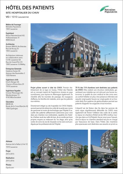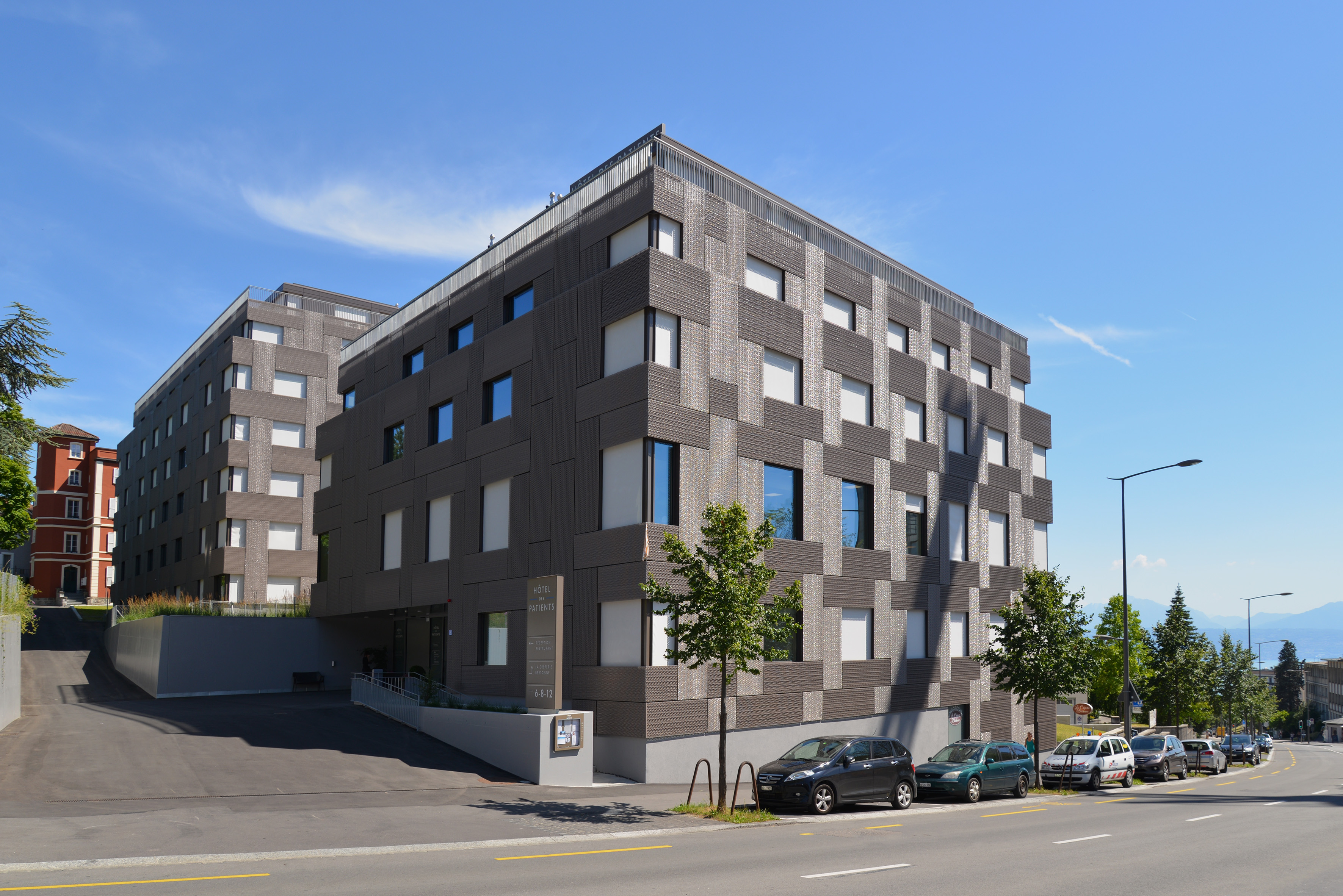 résulte d’une étroite collaboration entre le CHUV, la société Reliva à Zurich qui développe et exploite ce type d’hôtels en Suisse, ainsi que les Retraites Populaires qui ont agi comme investisseurs et maître d’ouvrage à hauteur de 33 millions de francs. Les deux bâtiments de couleur taupe surplombent la ville et l’entrée principale du CHUV. L’Hôtel des patients, inauguré en novembre 2016, se distingue par un revêtement de façades comme une signature à l’identité forte et originale. Composé de tôles pressées thermolaquées, il rappelle une couverture par son aspect textile, variant au gré de la journée et de la lumière.