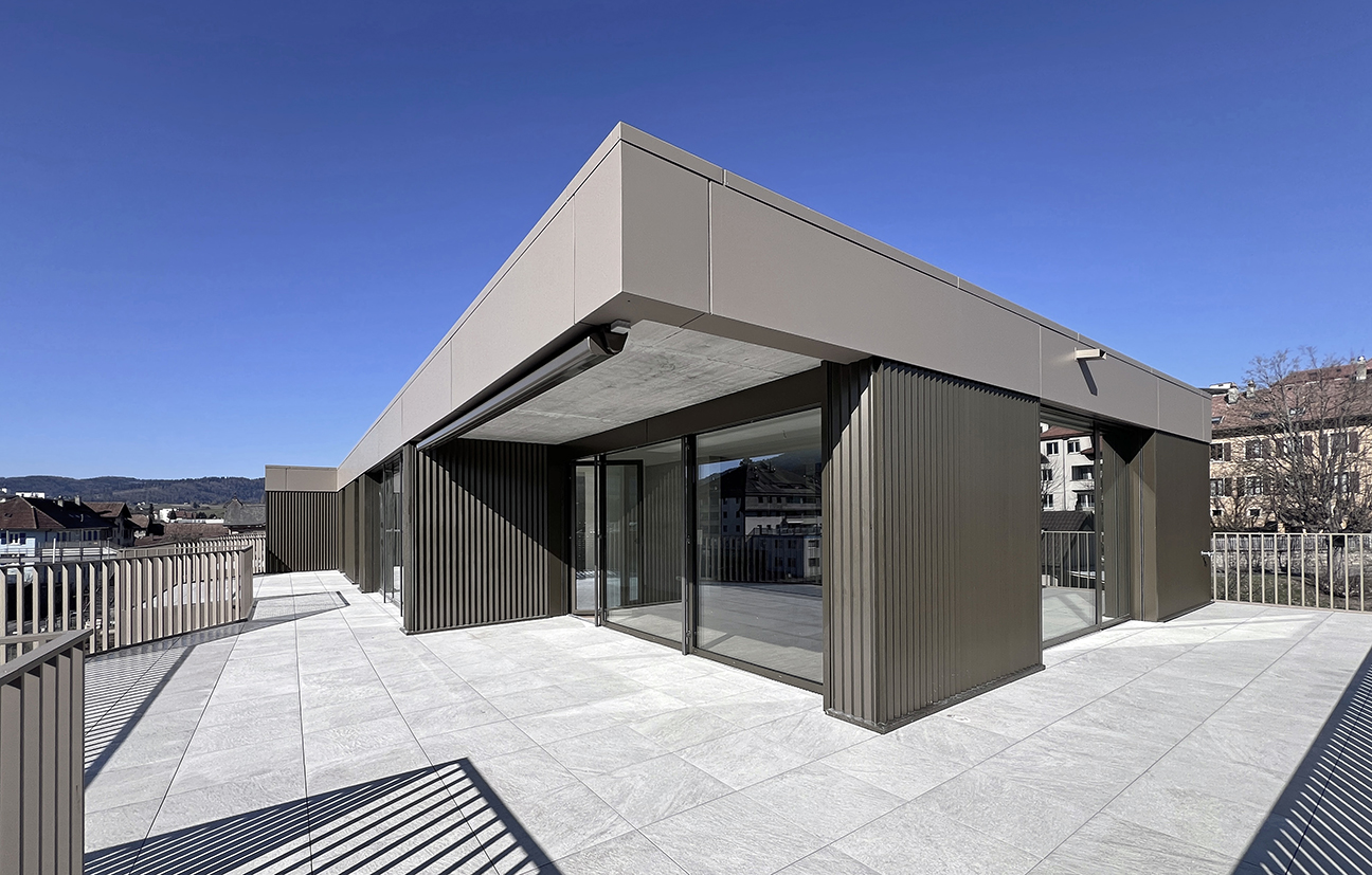 Le rez-de-chaussée, 1er et 2ème sont identiques et comprennent chacun 3 appartements de 3 pièces et 3 appartements de 4 pièces en alternance, permettant de stimuler la mixité de résidents. Chaque appartement possède une buanderie privative et les 4 pièces sont dotés d’une deuxième salle d’eau dans la suite parentale. En attique, les appartements de 6 pièces bénéficient de larges terrasses. Les façades ventilées sont traitées avec un revêtement profilé en aluminium couleur bronze, dans l’esprit des couleurs du lieu, mais aussi de la fonderie toute proche dont le bronze est une des matières premières. Elles seront aussi traitées, leur permettant d’être moins sensibles aux poussières volantes dégagées par le chemin de fer. Les balcons en façade sud, par l’alternance de biais à 45 degrés à gauche et à droite, génèrent une dynamique intéressante, accentuée par le jeu des barreaux métalliques.