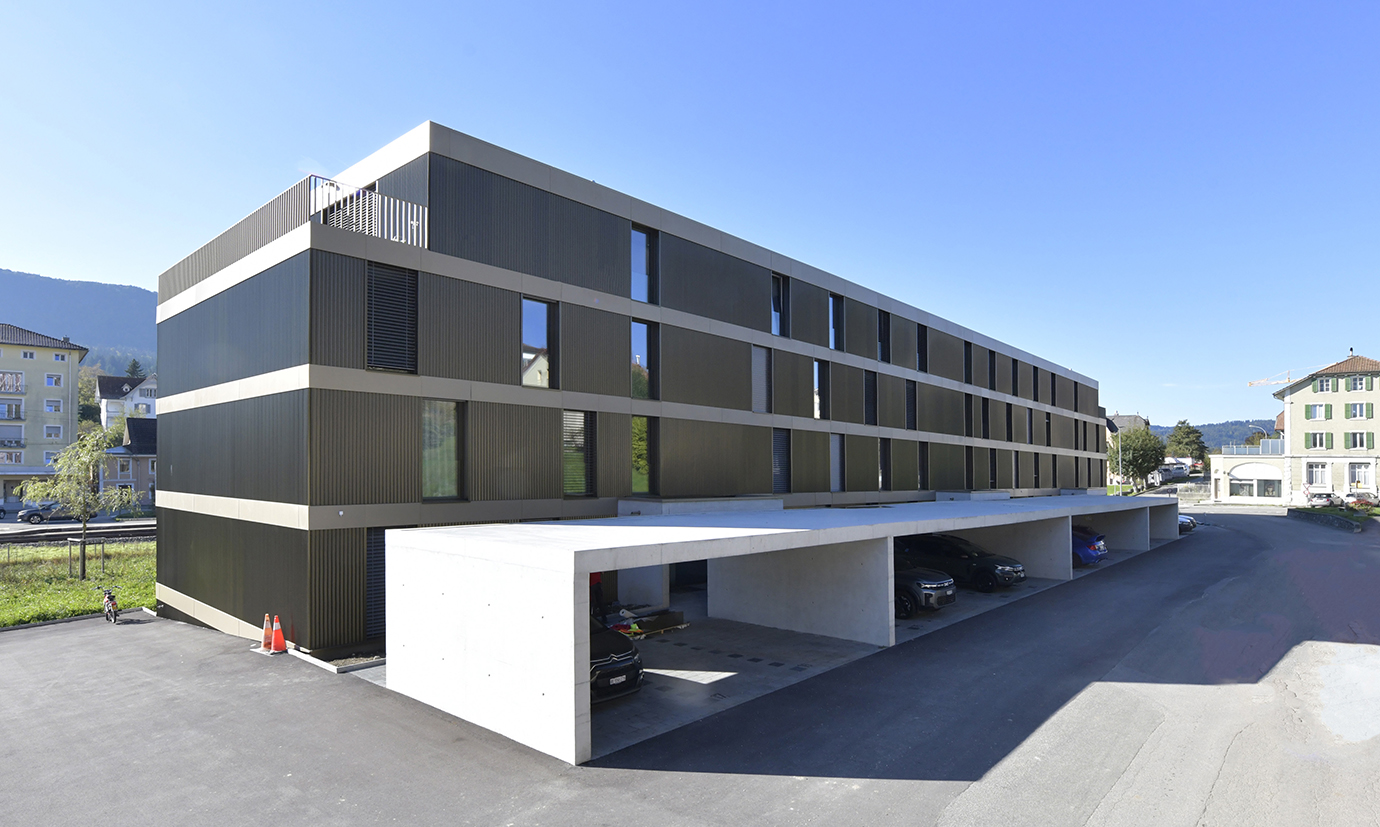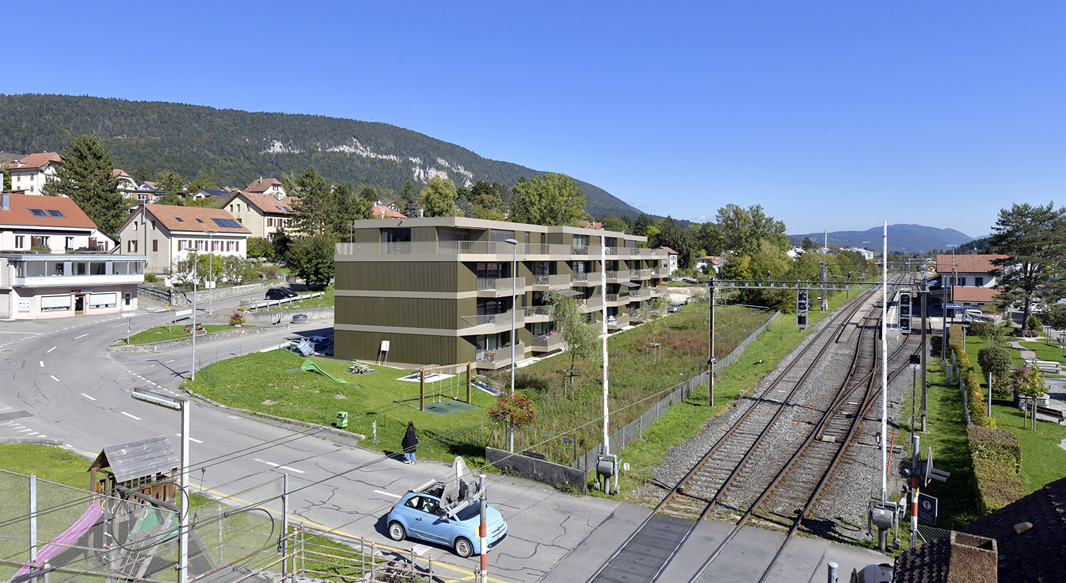 Redonner vie au centre de la localité. En face de la gare, le projet occupe une parcelle laissée en friche depuis la démolition, il y a de nombreuses années déjà, de la fabrique d’horlogerie "Helvetia". La volonté du Maître de l’ouvrage était de construire au centre du village, afin que des familles ou des personnes âgées puissent revenir vivre plus près des commodités, et de limiter l’exode vers les quartiers périphériques. Le projet est en fait un bâtiment rectiligne, qui reprend l’esprit de longueur des bâtiments le long de la rue du Moulin. Cela permet également de réduire les coûts en réalisant finalement trois immeubles, qui n’en forment qu’un, dans le but de