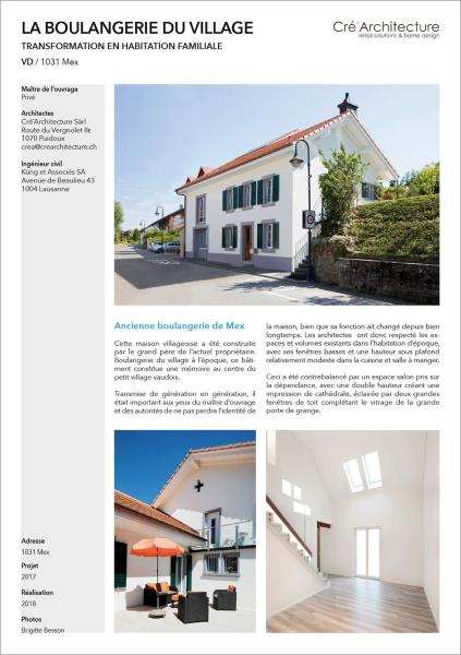 Ancienne boulangerie de Mex. Cette maison villageoise a été construite par le grand père de l’actuel propriétaire. Boulangerie du village à l’époque, ce bâtiment constitue une mémoire au centre du petit village vaudois. Transmise de génération en génération, il était important aux yeux du maître d’ouvrage et des autorités de ne pas perdre l’identité de la maison, bien que sa fonction ait changé depuis bien longtemps. Les architectes ont donc respecté les espaces et volumes existants dans l’habitation d’époque, avec ses fenêtres basses et une hauteur sous plafond relativement modeste dans la cuisine et salle à manger. Ceci a été contrebalancé par un espace salon pris sur la dépendance, avec une double hauteur créant une impression de cathédrale, éclairée par deux grandes fenêtres de toit complétant le vitrage de la grande porte de grange. Des panneaux solaires ont été couplés à la nouvelle production de chaleur de la maison, associés à une isolation performante, nous obtenons un logement de caractère, ayant conservé son âme et énergétiquement efficient. Pensé et dessiné avec des matériaux simples et peu coûteux, tout l’effet se trouve dans les choix effectués. Un des points centraux pour le maître d’ouvrage est le bar sur mesure réalisé par un artisan menuisier avec l’ancien plancher de la grange et qui apporte son caractère à la grand'pièce à vivre. Les niches murales irrégulières donnent de la profondeur à l’escalier et une touche d’excentricité. Pour terminer, la cuisine discrète agrémentée d’un brin de folie en couleur sur les murs. La magnifique terrasse complète ce logement et donne sur un petit jardin cosy.