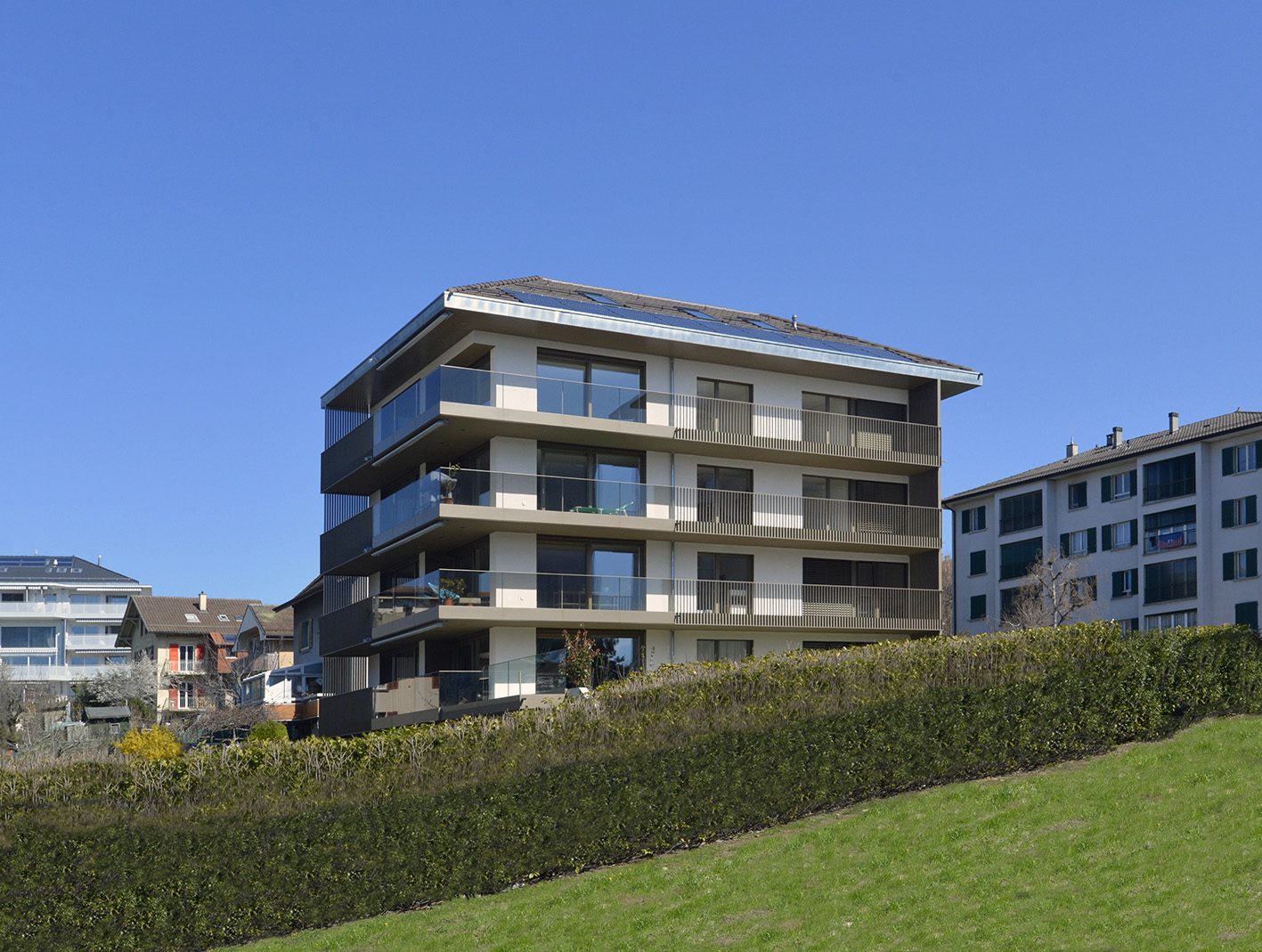 Immeuble résidentiel – Prilly Ce petit immeuble construit dans un quartier fortement urbanisé s’insère à l’articulation entre les zones de moyenne et de forte densité. L’enjeu était de lui donner sa place. L’option a été prise de réaliser un appartement par étage, de donner ainsi la meilleure qualité spatiale possible et de contrecarrer l’ambiance extérieure très urbaine. Les aménagements extérieurs préservent le bâtiment et confèrent au lieu un caractère plus privatif.