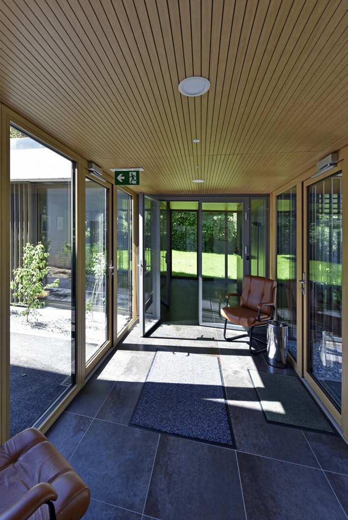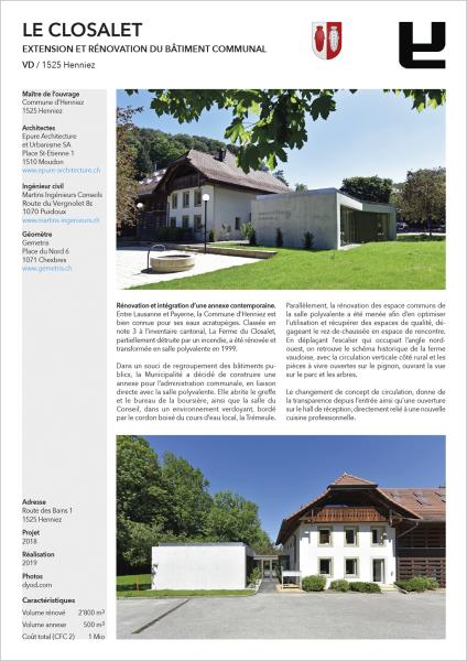 Rénovation et intégration d’une annexe contemporaine. Entre Lausanne et Payerne, la Commune d’Henniez est bien connue pour ses eaux acratopèges. Classée en note 3 à l’inventaire cantonal, La Ferme du Closalet, partiellement détruite par un incendie, a été rénovée et transformée en salle polyvalente en 1999. Dans un souci de regroupement des bâtiments publics, la Municipalité a décidé de construire une annexe pour l’administration communale, en liaison directe avec la salle polyvalente. Elle abrite le greffe et le bureau de la boursière, ainsi que la salle du Conseil, dans un environnement verdoyant, bordé par le cordon boisé du cours d’eau local, la Trémeule. Parallèlement, la rénovation des espace communs de la salle polyvalente a été menée afin d’en optimiser l’utilisation et récupérer des espaces de qualité, dégageant le rez-de-chaussée en espace de rencontre. En déplaçant l’escalier qui occupait l’angle nord-ouest, on retrouve le schéma historique de la ferme vaudoise, avec la circulation verticale côté rural et les pièces à vivre ouvertes sur le pignon, ouvrant la vue sur le parc et les arbres. Le changement de concept de circulation, donne de la transparence depuis l’entrée ainsi qu’une ouverture sur le hall de réception, directement relié à une nouvelle cuisine professionnelle. Une plateforme assure désormais la liaison entre les niveaux pour les personnes à mobilité réduite. Le remplacement du système de chauffage complète la transformation. Au sous-sol, la suppression des citernes à mazout a permis la création d’un local d’archives au climat régulé. La nouvelle annexe, distincte du Closalet, se démarque de l’existant et s’insère harmonieusement dans le parc avec sa liaison légère sur la façade rénovée, créant un retrait avec l’existant. Arche en béton au remplissage verre et serrurerie, la matérialité minérale de l’extérieur contraste avec l’intérieur doublé d’un revêtement chêne chaleureux, par ailleurs excellent absorbant phonique, et équipé de fenêtres bois-alu. Le béton apparent est rehaussé d’une engravure en bas relief dans la façade côté village avec les armoiries communales et les aménagement extérieur sont refaits comme la place pour apéritifs, la place de jeux déplacée ou les cheminement piétons.