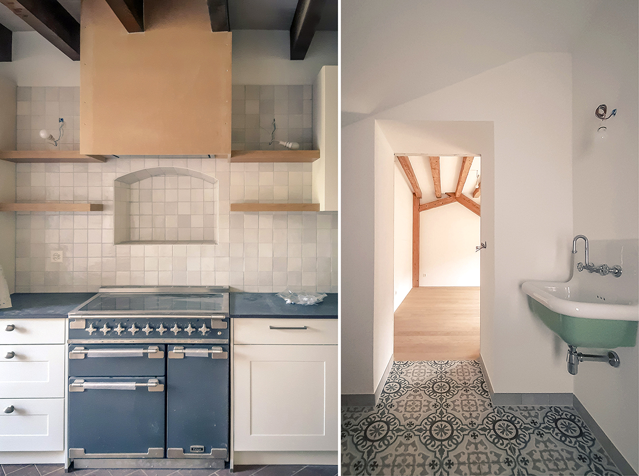 Tous les matériaux ont été choisis avec soin, en respectant les conditions du plan de site et les recommandations de l’Office du patrimoine et des sites. Ainsi, la couverture en tuiles mécaniques a été remplacée par des tuiles d’argile plates de Bardonnex, les fenêtres de toit sont encastrées, affleurées à la tuile et positionnées harmonieusement et sans prétention, et la maçonnerie en façade a été consolidée et revêtue d’un crépi à la chaux.