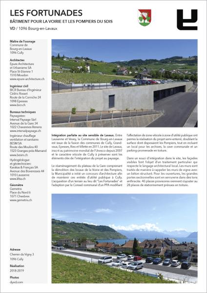 Intégration parfaite au site sensible de Lavaux. Entre Lausanne et Vevey, la Commune de Bourg-en-Lavaux est issue de la fusion des communes de Cully, Grandvaux, Epesses, Riex et Villette en 2011. Le site de Lavaux, inscrit au patrimoine mondial de l’Unesco depuis 2007 et le caractère viticole de Cully à préserver sont les éléments clés de l’intégration du projet au paysage. Le réaménagement du plateau de la Gare comprenant la démolition des locaux de la Voirie et des Pompiers, la Municipalité a initié un concours d’architecture afin de maintenir ces entités d’utilité publique à Cully. L’acquisition d’un terrain au lieu dit "Les Fortunades" et l’adoption par le Conseil communal d’un PPA modifiant l’affectation de zone viticole à zone d’utilité publique ont permis la réalisation du projet semi-enterré, doublant la surface dont disposaient les Pompiers, tout en incluant un local pour les archives, la cave communale et un parking-promenade en toiture. Dans un souci d’intégration dans le site, les façades visibles font l’objet d’un traitement particulier qui respecte le langage architectural local. Les murs sont traités de manière à rappeler les murs de vigne avec un béton structuré. Pour les ouvertures, les grandes portes sectionnelles sont en serrurerie dans des tons anthracite. 40 places provisoires viennent s’ajouter au 28 places de stationnement prévues en toiture. Mais ce provisoire devra disparaitre une fois le P+R Cully-Gare mis en service pour laisser place à une zone végétalisée avec du mobilier urbain et une fontaine. Le nouveau bâtiment s’insère dans la topographie existante sous la forme d’un socle allongé qui complète le paysage de murs existants et intègre les liaisons piétonnes et routières sur chaque côté du bâtiment: les murs du nouveau socle accompagnent les nouvelles liaisons et étirent le volume qui devient un élément structurant du site, tout en minimisant son impact visuel dans le paysage. Constructivement, le bâtiment est essentiellement en béton armé et briques silico-calcaire pour les murs de séparations. Les techniques sont laissées apparentes et l’aspect reste brut et fonctionnel. La cave communale est climatisée et les locaux d’archivage sont rehaussés par la teinte vive du sol et de l’escalier.