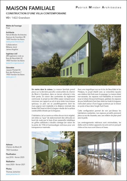 Avec une magnifique vue sur le lac de Neuchâtel et les Préalpes, le projet établit avec sa volumétrie épurée une relation très forte avec le paysage. La maison étant non-excavée, les espaces non-habitables se trouvent sous la toiture (locaux techniques, galetas), les espaces de jour bénéficiant d’une baie vitrée sur toute la longueur, s’articulant autour d’une loggia soutenue par la toiture en porte-à-faux dans l’angle Sud-Ouest.