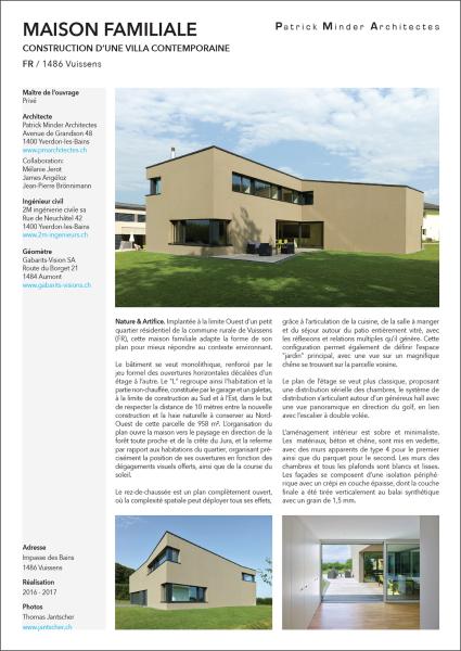 Nature & Artifice. Implantée à la limite Ouest d’un petit quartier résidentiel de la commune rurale de Vuissens (FR), cette maison familiale adapte la forme de son plan pour mieux répondre au contexte environnant.
