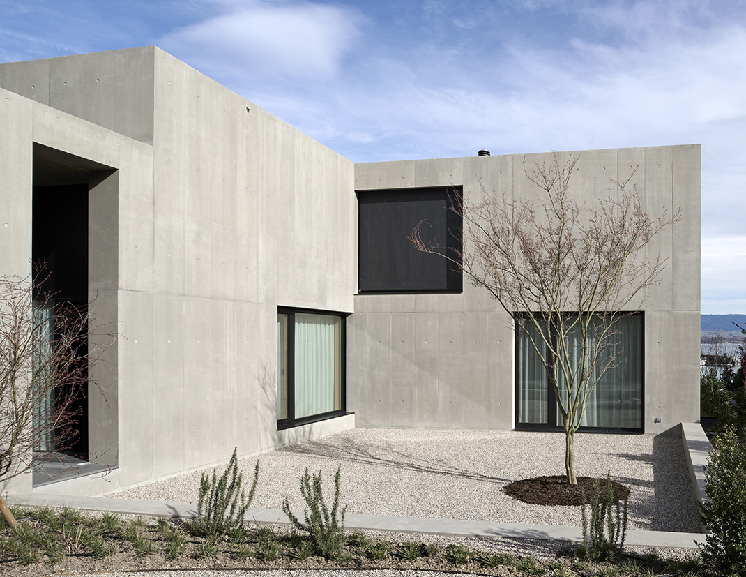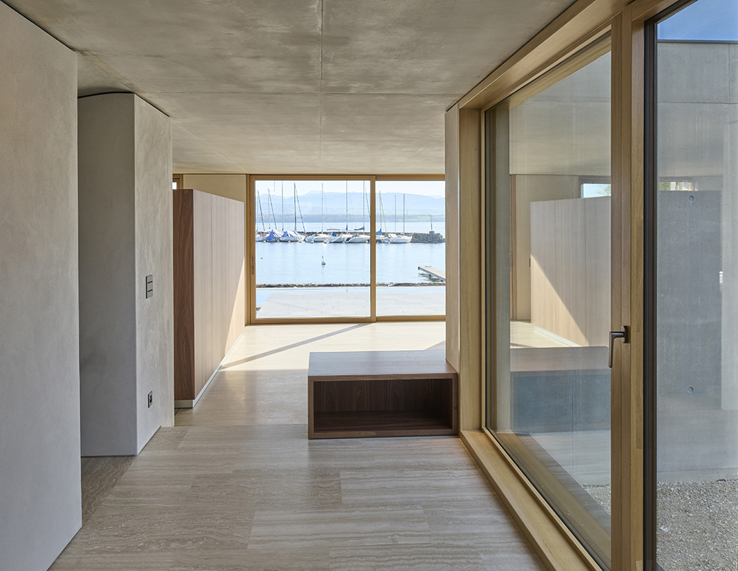 Epurée et élégante. La villa s’implante sur une parcelle située en bordure de la route Suisse à l’Ouest et du lac Léman à l’Est. Discret depuis la route, le volume de la maison permet à la fois de gérer la différence de niveau entre la route et le lac et de créer trois espaces extérieurs clairement distincts: une cour d’accès en partie supérieure, un patio contemplatif en contrebas de la route et un espace de détente face au lac et aux Alpes.
