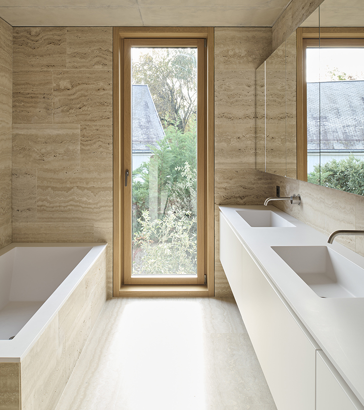 Les surfaces des locaux humides et le sol du rez sont habillés de travertin.