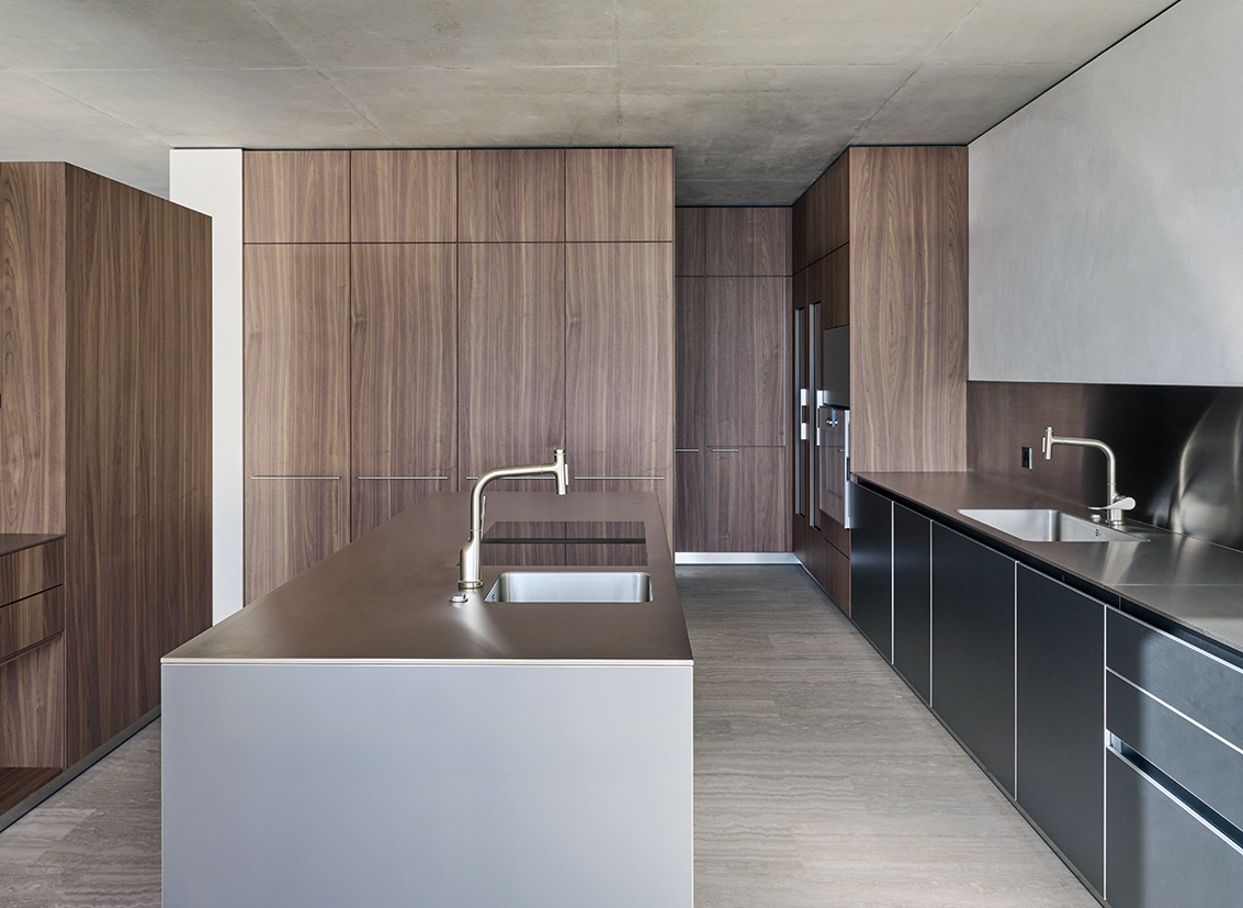 La maison est organisée et distribuée verticalement par un escalier discret, intégré dans un noyau vertical éclairé naturellement par un lanterneau, qui jouxte la circulation principale. Sur chacun des trois niveaux de vie, la figure de la circulation se répète pour distribuer les espaces de manière rayonnante et semblable.