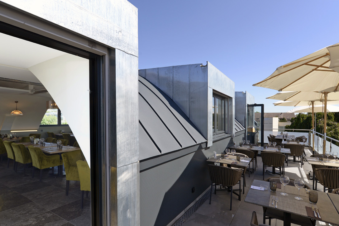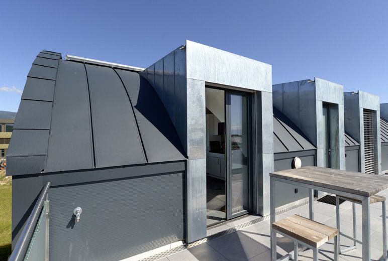 Restaurant et appartement de service. Situé au 28 de l’Avenue du Mont-Blanc, à mi-distance entre la Route Suisse et la gare, le bâtiment bénéficie d’une visibilité exceptionnelle sur la principale artère d’accès à Gland. L’immeuble commercial avait été construit en deux étapes au cours des années 80. Comprenant un rez-de-chaussée en béton armé surmonté d’un étage en charpente métallique et toiture plate. Afin d’optimiser l’investissement, le maître d’ouvrage a sollicité le bureau Zimmermann architectes SA pour une étude minutieuse du règlement communal dans cette zone industrielle. La solution d’ajouter un étage et de rénover l’existant en une seule opération s’est rapidement imposée, d’autant que l’analyse structurelle des ingénieurs civils le permettait, moyennant un léger renforcement statique. C’est une surélévation en charpente métallique qui a été retenue, pour sa légèreté et sa rapidité de mise en oeuvre. Une fois la structure montée, des panneaux sandwich légers et isolés sont posés et complétés par une finition intérieure en placoplâtre. La toiture arrondie, plutôt qu’à pans inclinés, permet de dégager des volumes intéressants pour le restaurant, comme pour l’appartement attenant de 4 pièces, dévolu à l’exploitant. Les terrasses de part et d’autre offrent un joli dégagement côté Lac ou Jura et offrent un avantage considérable à l’exploitation du restaurant de 80 places. Au rez-de-chaussée, la quincaillerie a déménagé dans le bâtiment voisin, laissant sa place à un magasin d’alimentation Bio, alors que le premier étage est destiné à des bureaux. Les circulations verticales sont assurées par le prolongement de l’escalier extérieur et la création d’un ascenseur desservant tous les étages. 140 m² de panneaux photovoltaïques. Réalisée par la SEIC voisine, l’installation couvre la toiture avec un maximum de panneaux solaires, pour une production annuelle estimée à 22’525 kWh. Un concept innovant est mis en oeuvre avec l’autoconsommation de l’énergie en RCP (Regroupement dans le cadre de la Consommation Propre). Les propriétaires d’installations solaires ont désormais la possibilité de valoriser leur production photovoltaïque en la proposant aux autres occupants de l’immeuble. Ils constituent et assurent la gestion d’un micro-réseau de distribution afin d’alimenter les membres du regroupement en électricité. SEIC réalise des installations photovoltaïques et, de par ses compétences historiques et son expertise, elle conçoit et met en place ces micro-réseaux ainsi que l’infrastructure de comptage nécessaire. Sur mandat du représentant du regroupement, elle assure également la gestion du comptage et de la facturation de chacun des consommateurs.