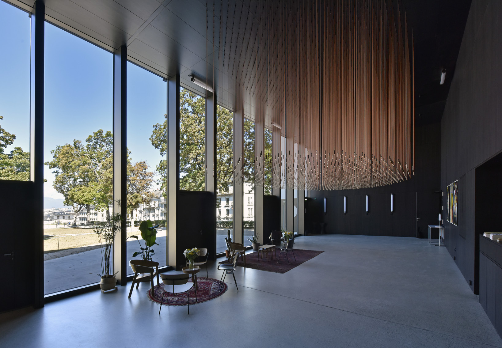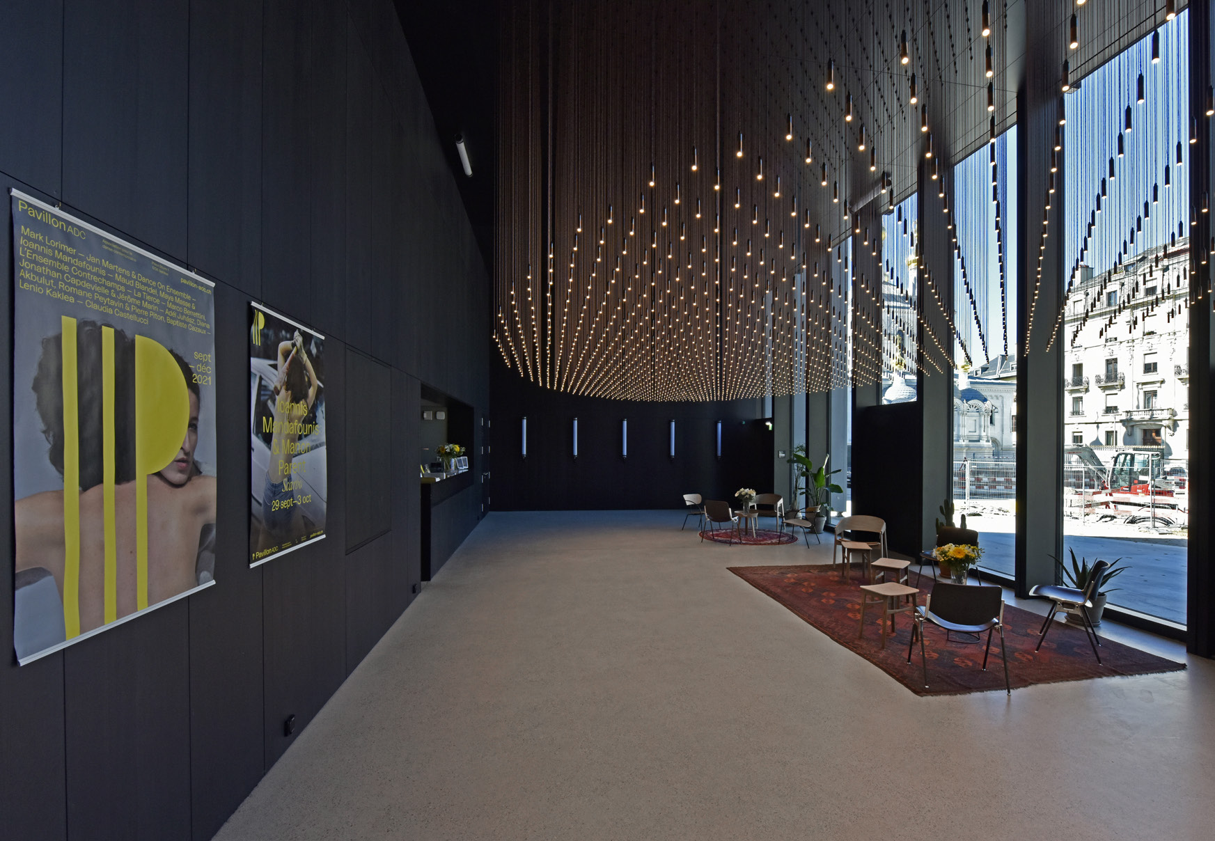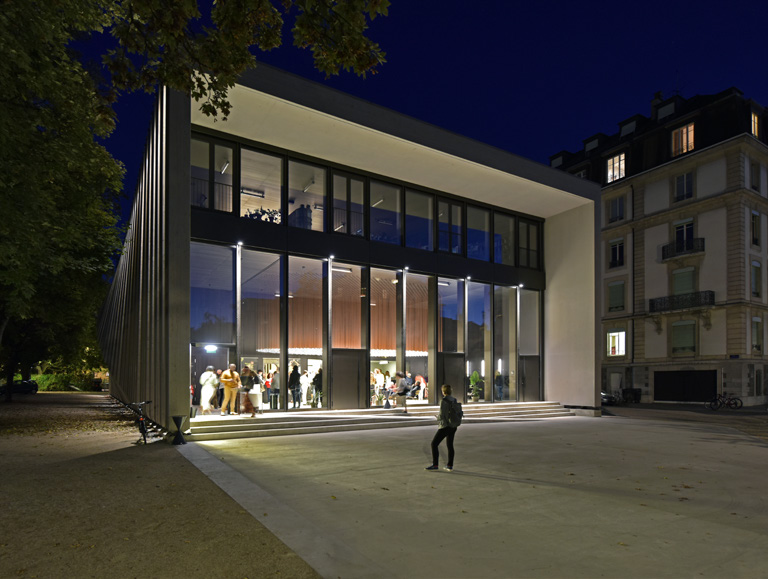 Les dimensions conséquentes du bâtiment avec ses 51 mètres de long pour 19 de large et 11 de haut, ne nuisent en rien à son esthétique, dégageant dynamisme et flexibilité dans le mouvement des façades qui brisent la monotonie et répond à l’élégance et à la grâce des danseurs qui animeront ce lieu. Côté esplanade, le hall d’entrée-foyer, est visible au travers de la façade entièrement vitrée, offrant sa transparence, avant de transformer le pavillon en écrin lumineux à la nuit tombée. Au plafond de ce bel espace d’accueil, une installation lumino-cinétique "The wind you never felt" de l’artiste Rudy Decelière, lauréat du concours lancé par le Fonds d’Art contemporain de la Ville de Genève, impressionne par sa légèreté et la vie que les 1’687 Led suspendus à des fils de cuivre font battre au cœur du foyer.