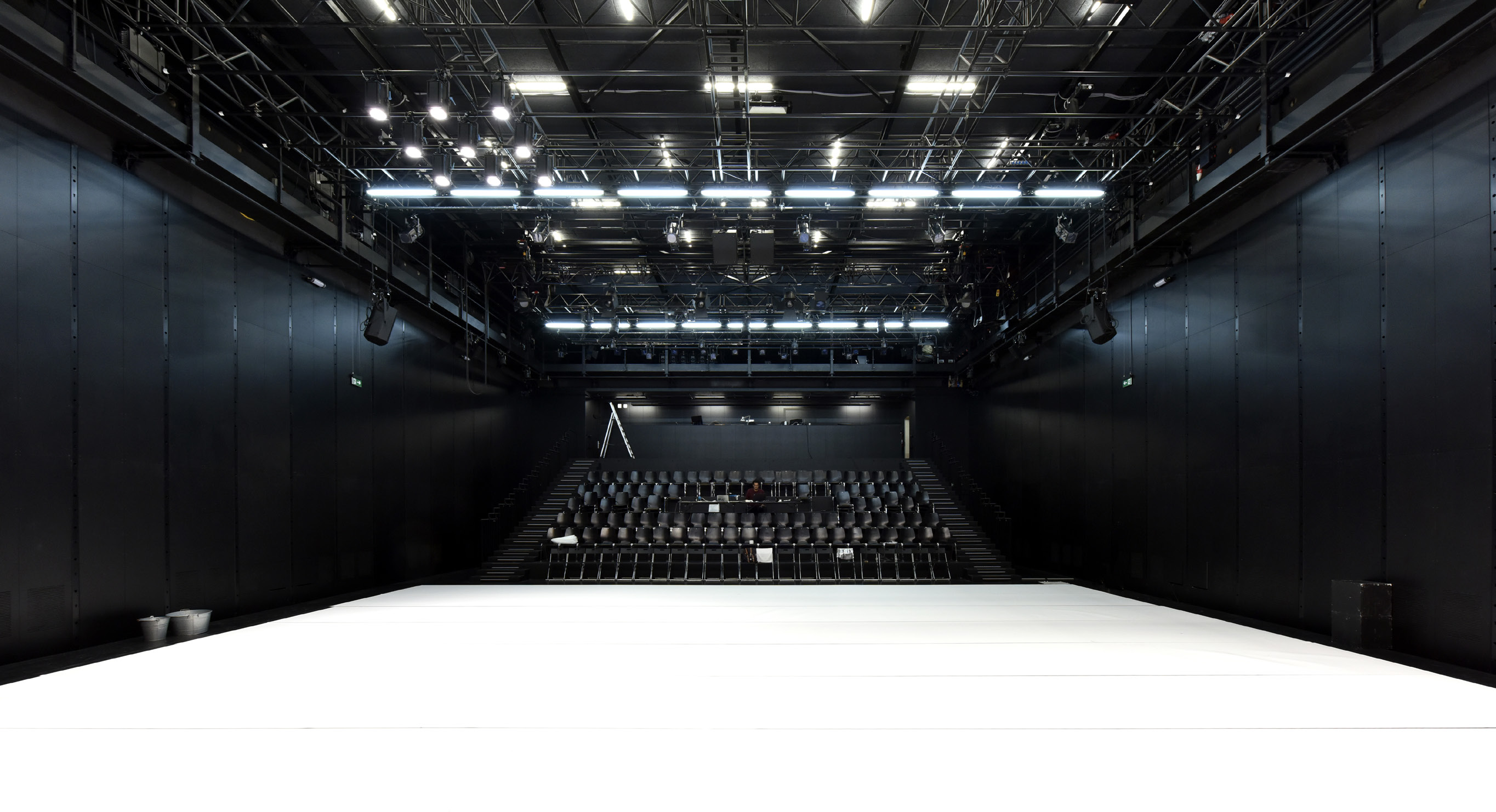 On pénètre ensuite dans la salle, d’une capacité de 200 personnes assises ou 400 sans les gradins démontables, dont l’acoustique a été particulièrement soignée. Au fond, la scène définit un espace de jeu de 12 mètres sur 12 et 9 mètres sous grill. A l’arrière de celle-ci, les loges et l’entrée des artistes côté Boulevard des Tranchées.