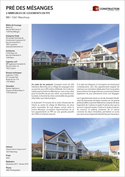 Un cadre de vie préservé. Comptant moins de 500 habitants, Marchissy est un village de campagne situé au pied du Jura à une altitude de 825 mètres. Sur le dernier replat avant la forêt et le Marchairuz, c’est un lieu idéal pour les familles de par son calme, sa proximité avec la nature, le bord du lac et les commodités de grandes villes telles que Gland et Nyon. A seulement 10 minutes de la sortie d’autoroute de Gland, au centre du village de Marchissy, les deux petits immeubles de trois étages, conçus selon la norme Minergie, accueillent respectivement 6 et 8 appartements en PPE sur une grande parcelle de 2’600 m² joliment arborée. Si le style est villageois, la conception est résolument contemporaine, avec des appartements baignés de soleil par une orientation idéale plein sud. Les grandes baies vitrées et de larges balcons couverts permettent également de jouir pleinement d’une vue dégagée. Un cadre de vie préservé. Comptant moins de 500 habitants, Marchissy est un village de campagne situé au pied du Jura à 825 mètres d’altitude. Sur le dernier replat avant la forêt et le Marchairuz, c’est un lieu idéal pour les familles de par son calme, sa proximité avec la nature, le bord du lac et les commodités de grandes villes telles que Gland et Nyon. A seulement 10 minutes de la sortie d’autoroute de Gland, au centre du village de Marchissy, les deux petits immeubles de trois étages, conçus selon la norme Minergie, accueillent respectivement six et huit appartements en PPE sur une grande parcelle de 2’600 m² joliment arborée. Si le style est villageois, la conception est résolument contemporaine, avec des appartements baignés de soleil par une orientation idéale plein Sud. Les grandes baies vitrées et les larges balcons couverts permettent également de jouir pleinement d’une vue dégagée. Les 5 appartements situés au rez-de-chaussée bénéficient de spacieuses terrasses ouvertes sur de grands jardins privatifs. Le premier bâtiment se compose de deux logements de 3 pièces et quatre 4 pièces alors que le second comprend quatre 3 pièces et quatre 4 pièces. Au sous-sol, le parking souterrain de 27 places connecte les deux immeubles, permettant un accès aux caves et aux logements directement par l’ascenseur. Organisé autour d’un parc. Sur cette parcelle soumise à un règlement de quartier très strict, les deux bâtiments s’intègrent dans l’architecture typique de Marchissy et, en particulier, du quartier du Pré-Baron. Tandis que la disposition des bâtiments, en biais, se libère de l’implantation traditionnelle du bâti, leurs volumétries, avec les pentes de toitures caractéristiques du quartier, assurent une parfaite intégration. L’implantation des bâtiments exploite au mieux les vues sur les champs et les collines avoisinantes, tout en libérant un espace végétalisé et arboré offert aux acquéreurs. Vers ce véritable espace de vie, appropriable par chacun, s’orientent tous les appartements et leurs vastes terrasses, marquées par des garde-corps soignés qui donnent à l’ensemble son identité. Le vaste parking souterrain et 5 places visiteurs en périphérie permettent de libérer la parcelle de tout véhicule. Le projet présente un bilan écologique favorable, obtenant le label Minergie©, grâce notamment à l’installation de panneaux photovoltaïques en toiture et à la ventilation contrôlée.