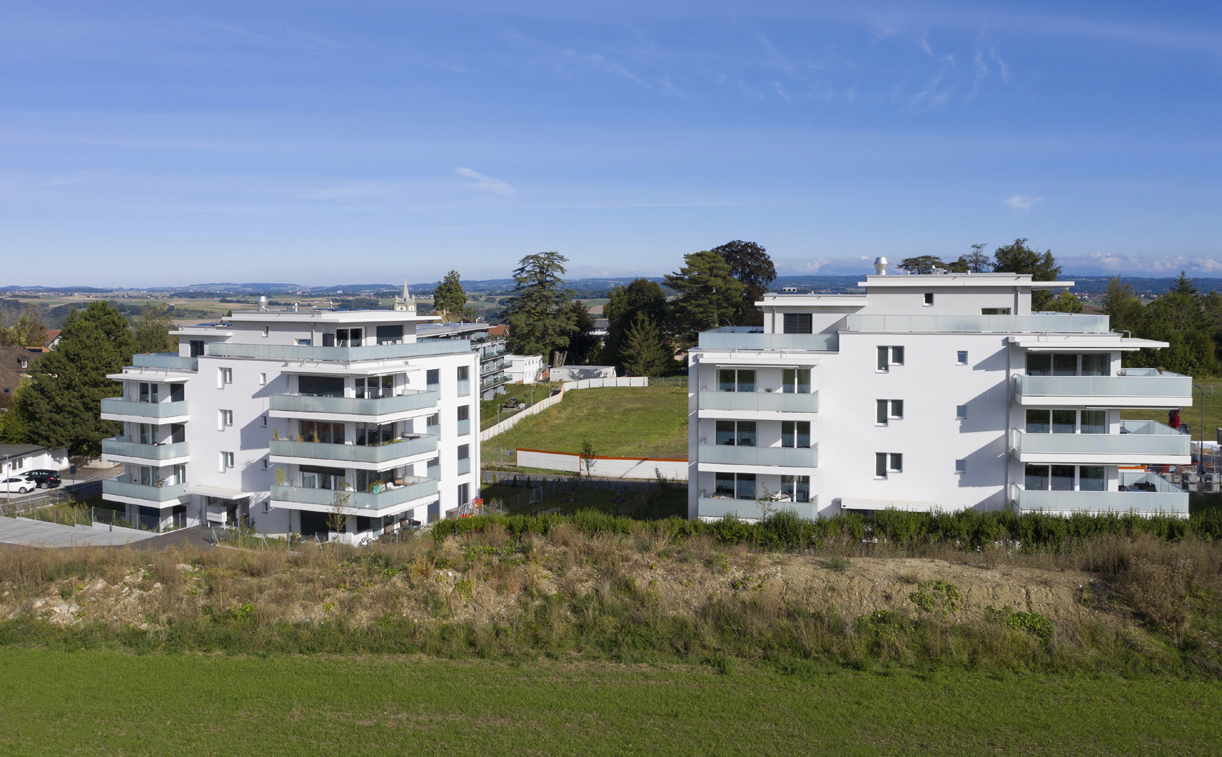Situation idéale pour les familles. Siégeant sur un plateau surplombant la Venoge, Cossonay est une ville en pleine croissance de près de 4’000 habitants. Située à une quinzaine de kilomètres de Lausanne, elle dispose de toutes les commodités nécessaires telles qu’un centre commercial, des écoles, un cinéma et des transports publics reliant la ville à la gare de Penthalaz au pied du funiculaire. La Résidence "Iris Bleu" est située sur la Route d’Aubonne, à seulement 300 mètres au Sud-Ouest du centre, face au nouveau centre scolaire et à la future piscine couverte municipale. Malgré la densité élevée du quartier, les nouvelles constructions destinées à la vente en PPE bénéficient d’un environnement verdoyant et calme avec vue sur les Alpes et le Lac Léman pour les attiques. Un prix de vente adapté permet d’élargir l’accès à la propriété, notamment aux jeunes familles, en proposant des logements accessibles à tous. Le nouveau plan général d’affectation, légalisé au début de l’année 2014, prévoit un développement considérable au cours des 15 prochaines années avec l’accueil attendu d’environ 1’500 nouveaux habitants. Pour la Commune, il s’agit de réaliser de nouveaux quartiers d’habitation de qualité, en harmonie avec leur environnement à l’image de bâtiments à la volumétrie contenue (4 niveaux et attique) dans un parc de verdure agissant comme zone tampon entre les nouvelles constructions et le tissu existant ainsi que la zone agricole. Vivre entre ville et campagne. La Résidence Iris Bleu se compose de deux immeubles de 13 appartements allant du 2.5 au 4.5 pièces. Les bâtiments sont orientés de sorte à bénéficier d’un maximum d’ensoleillement et pour que les habitants profitent de grands espaces confortables. De larges terrasses et balcons ont été pensés pour prolonger le séjour ou les chambres. Un parking souterrain de 25 places et 16 places extérieures canalisent les voitures dès l’entrée du quartier, préservant ainsi la quiétude des espaces verts et de la place de jeux entre les bâtiments. Modernité, simplicité et harmonie ont été les maîtres-mots qui ont inspiré les architectes pour imaginer cette résidence de standing aux façades fluides et élancées. Extérieurement, on remarque les garde-corps en verre satiné mat préservant l’intimité des balcons et les "casquettes" couronnant les attiques en retrait du volume principal selon les directives communales. Dotés d’une isolation périphérique efficiente, de triples vitrages et de panneaux solaires photovoltaïques, les immeubles s’affranchissent des labels écologiques, tout en répondant aux critères de la norme SIA 380/1 pour des constructions économes en énergies.