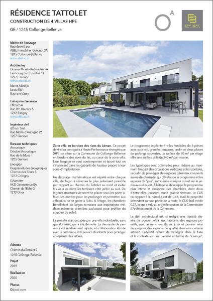 Un décalage mathématique est répété entre chaque villa, de façon à s’inscrire le plus justement possible par rapport au chemin du Tattolet au nord et éviter les vis à vis entre les terrasses côté jardin au sud. De légères structures viennent se placer sous les porte-à-faux des entrées pour les prolonger et permettre aux véhicules de se garer à l’abri. A l’étage, les chambres bénéficient de larges terrasses aux inspirations méditerranéennes orientées sud-ouest pour profiter du coucher de soleil. La parcelle était occupée par une villa individuelle, sans grand intérêt, qui a été démolie. La demande de permis a été relativement rapide, en collaboration étroite avec la commune et le service des forets pour protéger et replanter les arbres. Le programme implante 4 villas familiales de 6 pièces avec sous-sol, grandes terrasses, jardin et deux places de parkings couvertes. La surface de 80 m² par étage offre une surface utile de 240 m² par maison. Les typologies sont optimisées pour réduire au maximum l’impact des circulations verticales et horizontales, ceci afin de privilégier des espaces généreux et ouverts au rez-de-chaussée, qui développe le programme et les espaces de "jour", soit cuisine et séjour ouvert sur le jardin au sud-ouest. À l’étage se développe le programme plus intime et cloisonné des chambres, dont deux d’entre-elles jouissent d’une grande terrasse. Le CUS en rapport à la parcelle est de 0.44, mais la propriété s’étendant sur une partie de la route, le CUS final est de 0.32, ce qui a valu au projet le soutien de la Commission d’Architecture et de la Commune. Le défi architectural est ici malgré une densité élevée de pouvoir offrir aux habitants des espaces privatifs, avec le minimum de vis à vis et pouvoir ainsi s’approprier des espaces de qualité dans une certaine intimité. L’objectif restant de s’intégrer dans le tissu et le contexte sur une parcelle en forme de "losange". Le découpage et le décalage en plan et en coupe des volumes permettent une réponse élégante à cette problématique. De plus, il fallait intégrer les entrées, les circulations et huit places de parking couvertes dans une surface exiguë, sans dégrader l’harmonie de l’ensemble du projet et créer un ensemble architectural lisible et cohérent.