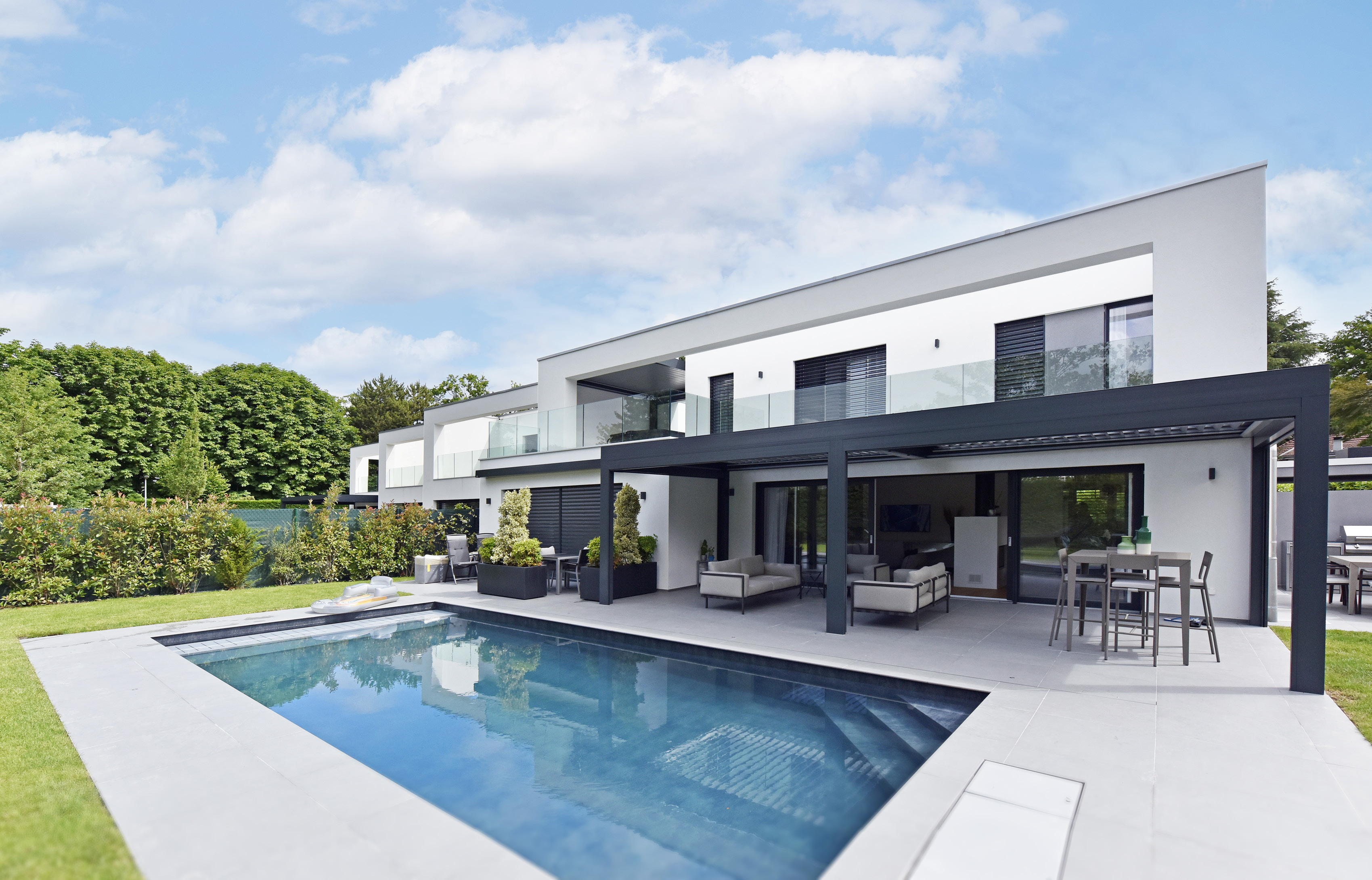 Construction traditionnelle. Les matériaux et les techniques utilisés sont classiques et ne présentent pas de particularité technique. Les fondations et les structures sont en béton armé, les "remplissages" en briques de terre cuite et le tout est protégé thermiquement par une importante épaisseur d’isolation thermique afin d’atteindre les coefficients HPE, habillé finalement par un crépi peint. La production de chaleur est elle aussi relativement classique: PAC individuelle, alimentée par des panneaux photovoltaïques en toiture. Les vitrages sont des triples verres isolants et coulissants. Les aménagements extérieurs sont soignés et la perméabilité du sol a été conservée et suivie avec attention, ceci afin de permettre à l’eau de pluie d’alimenter la nappe phréatique et ne pas surcharger inutilement les équipements publics. Une attention particulière a été portée aux arbres existants et à la plantation de nouveaux chênes dans les jardins et en bordure de route.