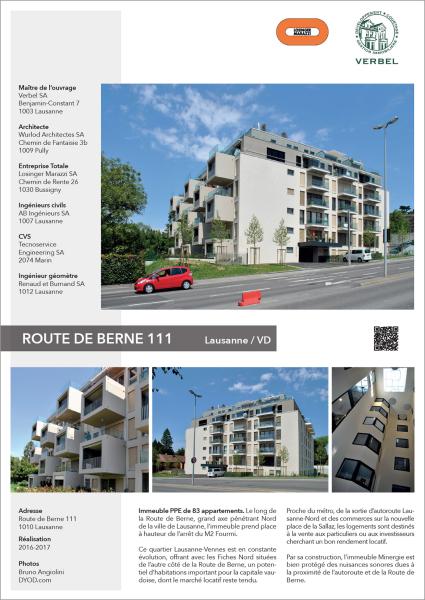 Immeuble PPE de 83 appartements. Le long de la Route de Berne, grand axe pénétrant Nord de la ville de Lausanne, l’immeuble prend place à hauteur de l’arrêt du M2 Fourmi.