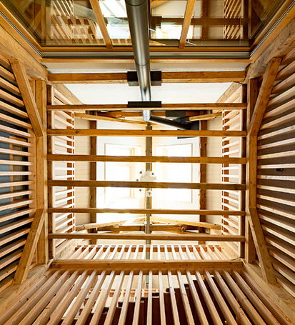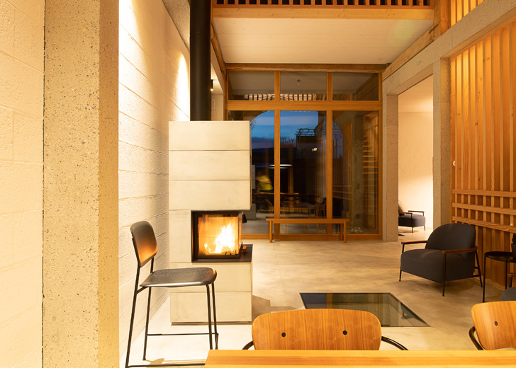 Le projet intérieur s‘articule autour d’un grand patio central, éclairé par des verrières en toiture, habillé par un lamage en pin douglas du Jura (cages d’escaliers, claustras et garde-corps) et terminant au sous-sol à travers une petite dalle de verre. Le programme vient ensuite s’insérer dans la belle charpente d’origine, transformée une fois au début du 20ème siècle.