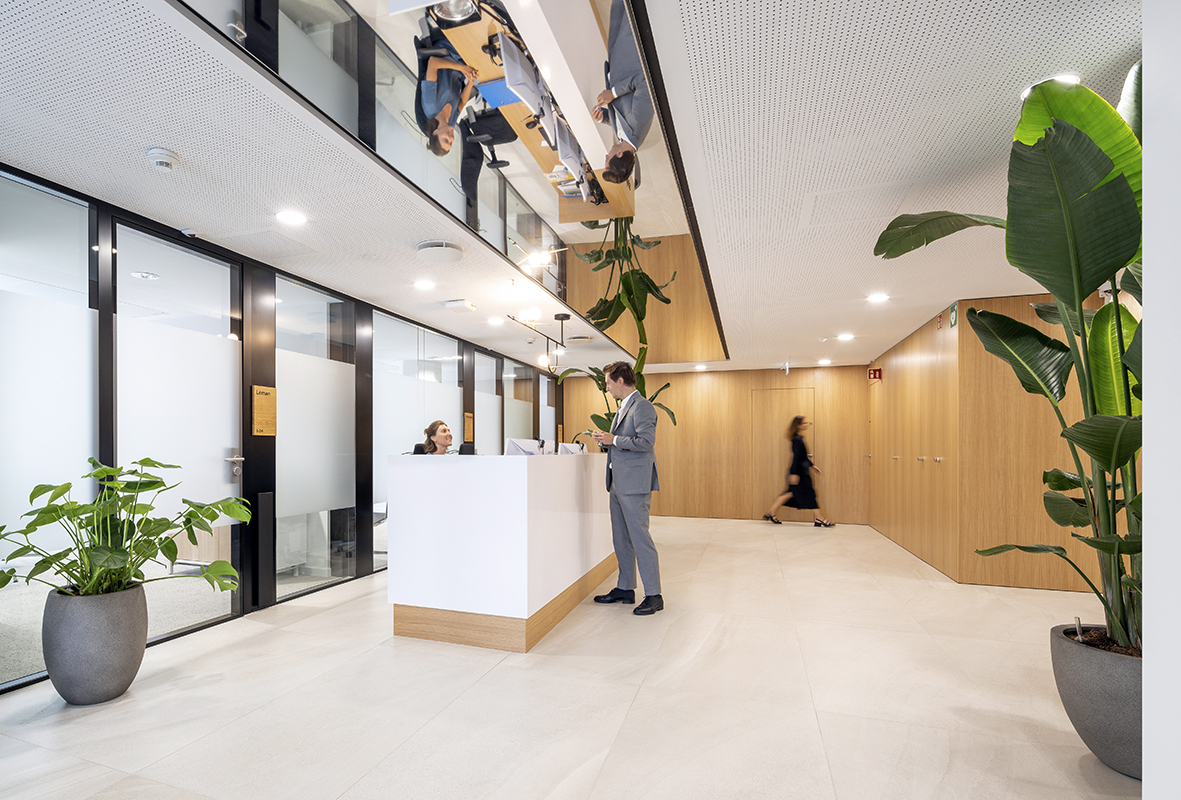 Le programme d’aménagement des bureaux pour plus de 50 collaborateurs se subdivise sur deux étages et 1’100 m² de surface. Au 6e étage, on accède à la réception, dont la hauteur semble doublée par la réflexion dans le plafond en miroir. Les six salons clients, avec leurs parois vitrées en partie translucide, entre luminosité et discrétion.