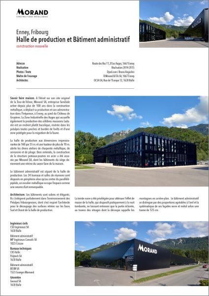 Savoir faire maison. A l’étroit sur son site originel de la Tour-de-Trême, Morand SA, entreprise familiale active depuis plus de 100 ans dans la construction métallique, a déplacé sa production et son administration dans l’Intyamon, à Enney, au pied du Château de Gruyères. La Zone Industrielle des Auges qui accueille également la production des célèbres macarons Ladurée est un endroit plutôt bucolique, insérée dans les préalpes toutes proches et bordée de forêts et d’une zone protégée pour la migration de la faune.