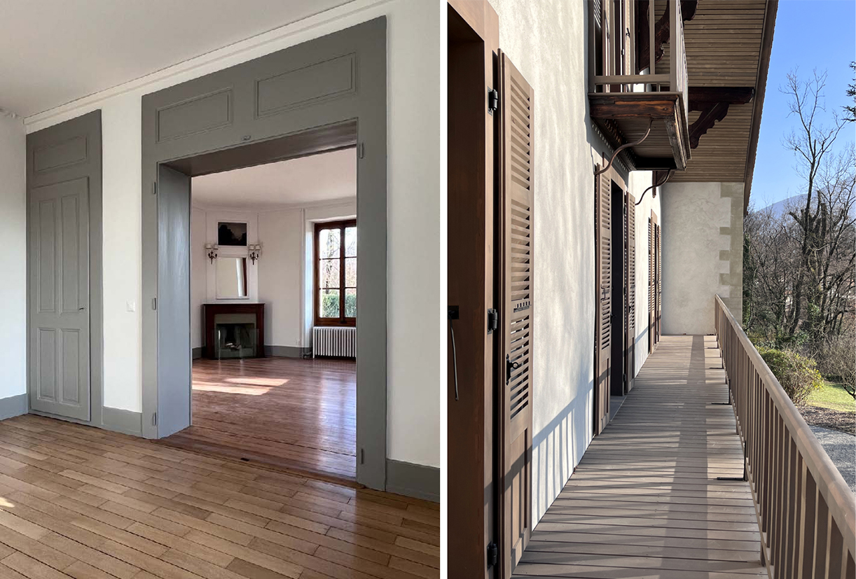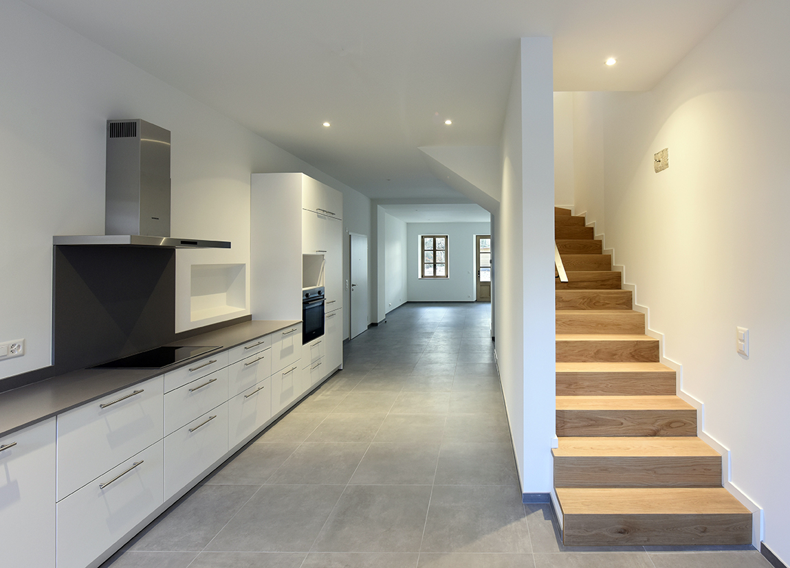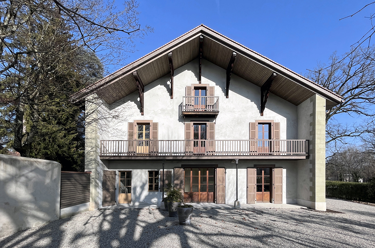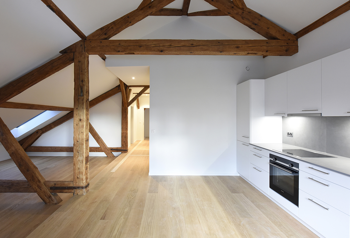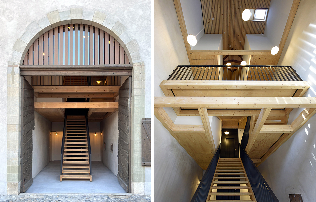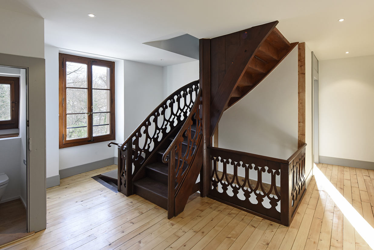 Dans la grande maison, l’accès principal est désormais central, par l’historique grande porte de grange. Un espace commun réunit la distribution aux quatre appartements. Un système d’escaliers et de passerelles traverse le volume sur trois niveaux. Un ascenseur aux normes handicapés dessert chaque niveau. L’appartement de 6 pièces en duplex est transformé en respectant sa typologie existante. Un appartement en duplex de 5 pièces et un studio sont créés dans l’ancienne étable et l’appartement existant de 3 pièces est transformé et mis aux normes. Pour la petite maison, datant de 1905, l’intervention se limite à la rénovation du logement existant. Un local technique et une chaufferie (PAC) commune est créée, complétée par la pose de panneaux solaires photovoltaïques en toiture du bâtiment annexe afin de respecter la toiture originale.