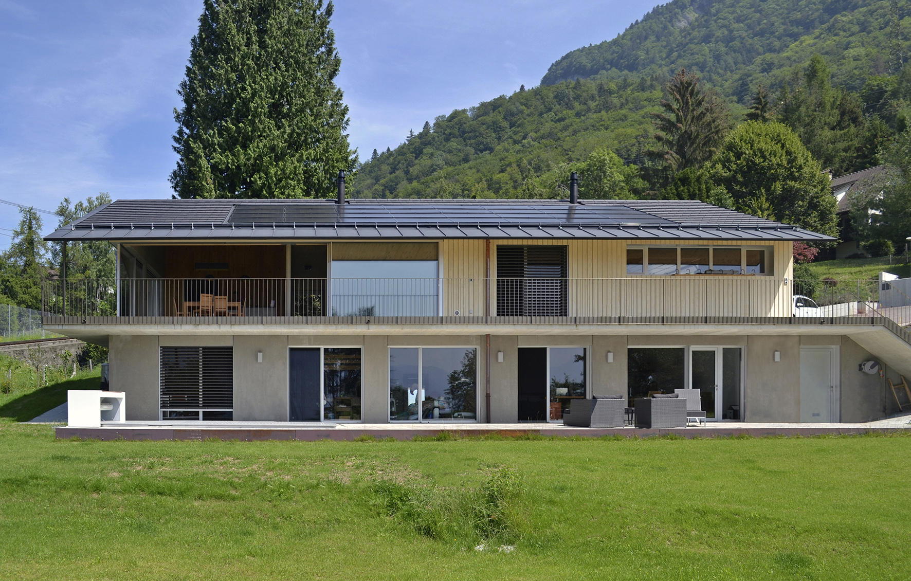 Sur les hauteurs de Blonay. En zone périphérique, la nouvelle construction s’intègre dans une topographie en pente, qui s’élance vers le lac Léman et les Alpes.