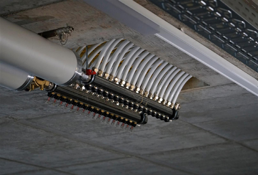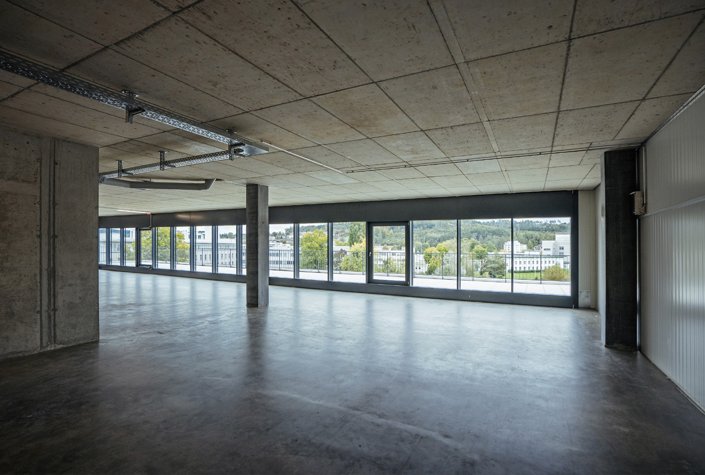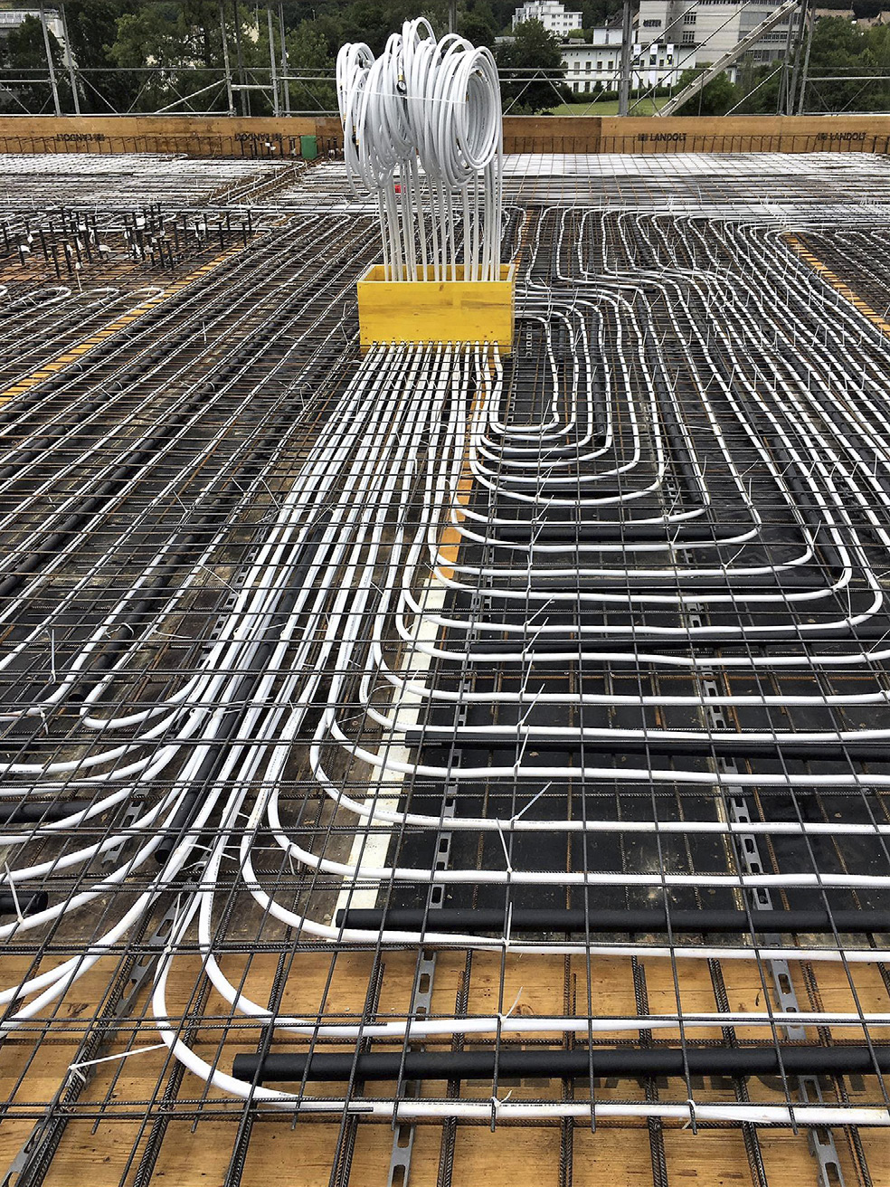 Le rafraichissement permet d’atteindre un haut niveau de confort dans le bâtiment et assure également la régénération de la sonde géothermique, de façon à maintenir un haut degré d’efficacité lors de la prochaine période de chauffage. Si la température de la sonde géothermique ne permet plus le rafraichissement, le système passe automatiquement en mode mécanique et la PAC fonctionne alors comme une climatisation. Les TABS (Thermoactive Component Systems) sont une solution innovante et économe en énergie pour le chauffage et le rafraichissement des bâtiments. Le béton est utilisé comme vecteur de stockage d’énergie et de rayonnement. Surface active 4’800 m² pour environ 30 km de tuyau composite 20 mm.