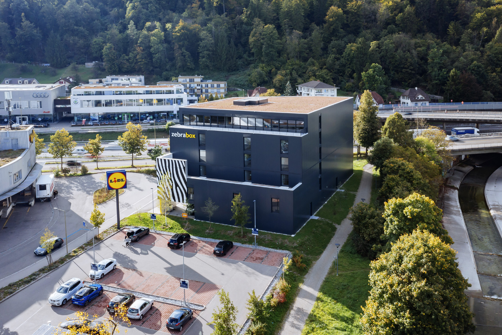 Un zèbre sur l’autoroute. Zebrabox Winterthur est le plus récent site de la chaîne de self-stockage en Suisse. Le bâtiment, situé directement sur l’autoroute entre Zurich et Saint-Gall, n’est pas seulement le dixième site, c’est aussi le premier Zebrabox construit par l’entreprise. La nouvelle succursale bénéficie d’un excellent emplacement directement à la sortie d’autoroute Winterthur Töss à côté de Lidl et Top CC. Sur six étages, des boxes de stockage individuels de 1 à 50 m² offrent la solution idéale pour chaque exigence d’espace.